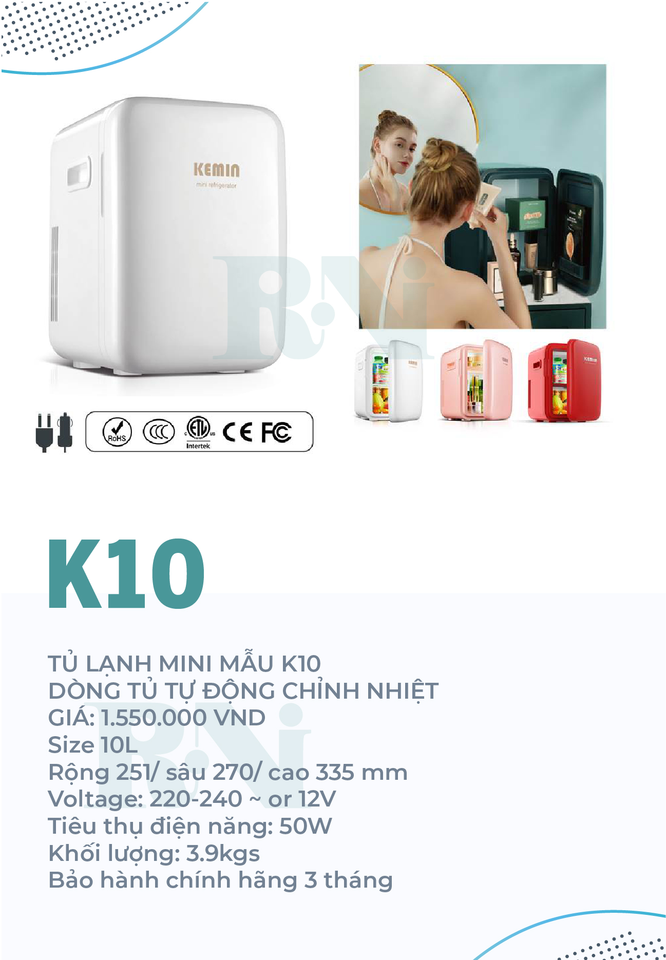 TỦ LẠNH MINI KEMIN 10L LÀ DÒNG TỦ TỰ ĐỘNG Tủ K10 có kích thước 28x26x34cm là dòng tủ tự động, cắm điện là sử dụng Làm nóng đến 65 độ C Làm lạnh 5-15 độ C Sử dụng ở nhà (220V-50W) và trên ô tô (12V) Lưu ý: Riêng K10 mặt gương không có điện 12V, không có chế độ nóng Lưu ý: Do tủ sử dụng công nghệ làm lạnh bán dẫn nên sẽ xảy ra hiện tượng ngưng tụ hơi nước, khách hàng cần vệ sinh thường xuyên hoặc lót khăn dưới đáy tủ cho thấm hút nước TỦ LẠNH MINI KEMIN VIỆT NAM do Công ty CP Đầu tư Quốc tế RNI nhập khẩu và phân phối chính hãng tại Việt Nam Vậy tủ mini kemin phù hợp với những đối tượng nào ️