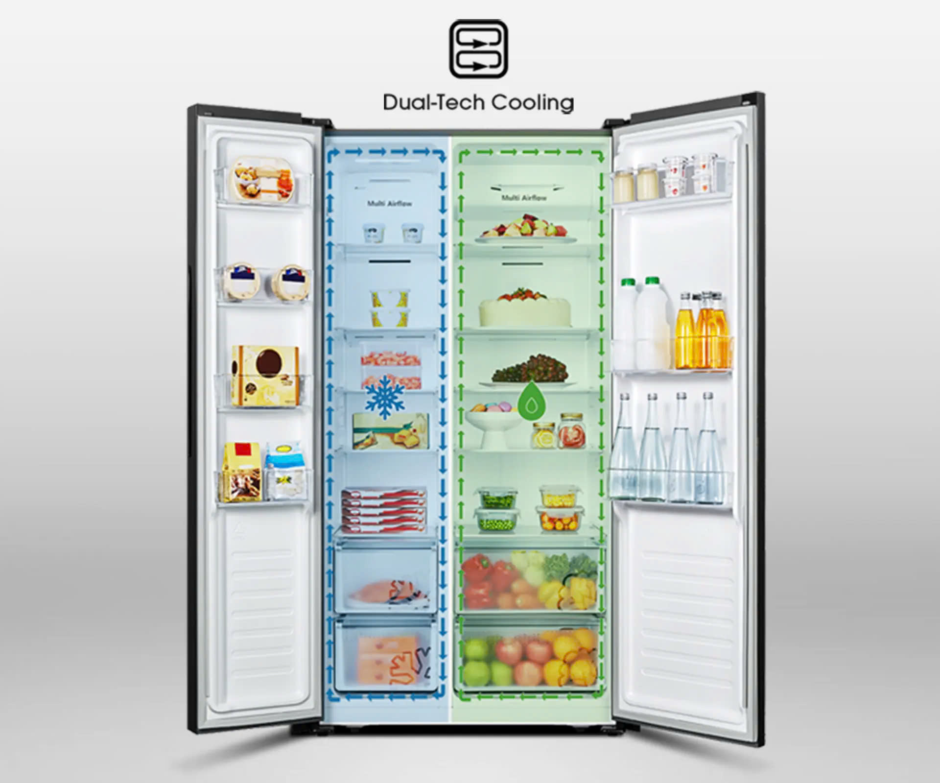 - Công nghệ Total No Frost loại bỏ việc tích tụ đá trong tủ lạnh, giúp bạn không cần phải rã đông thủ công. Điều này cũng giữ cho thực phẩm của bạn tươi ngon và toàn vẹn dưỡng chất trong thời gian dài hơn.