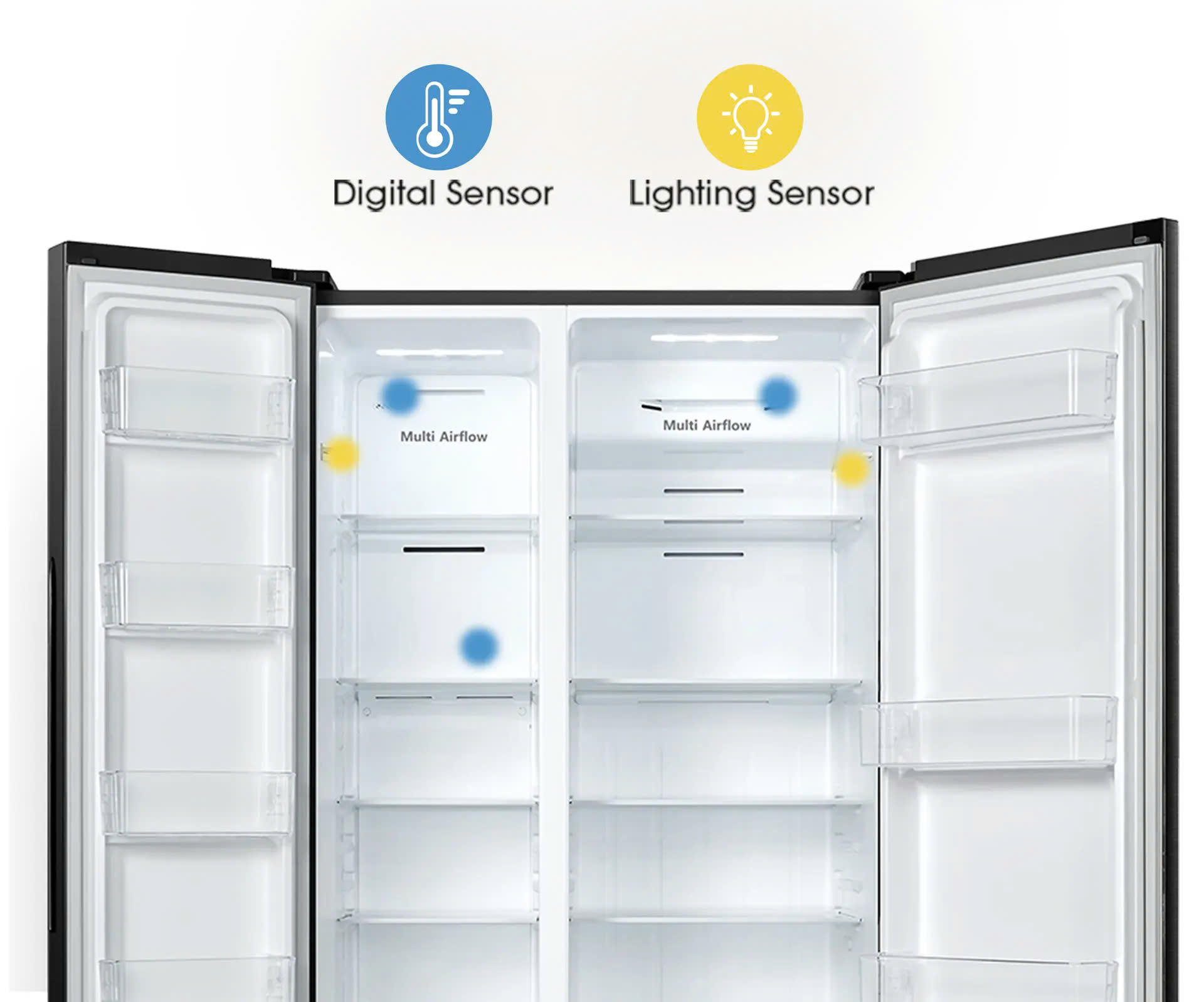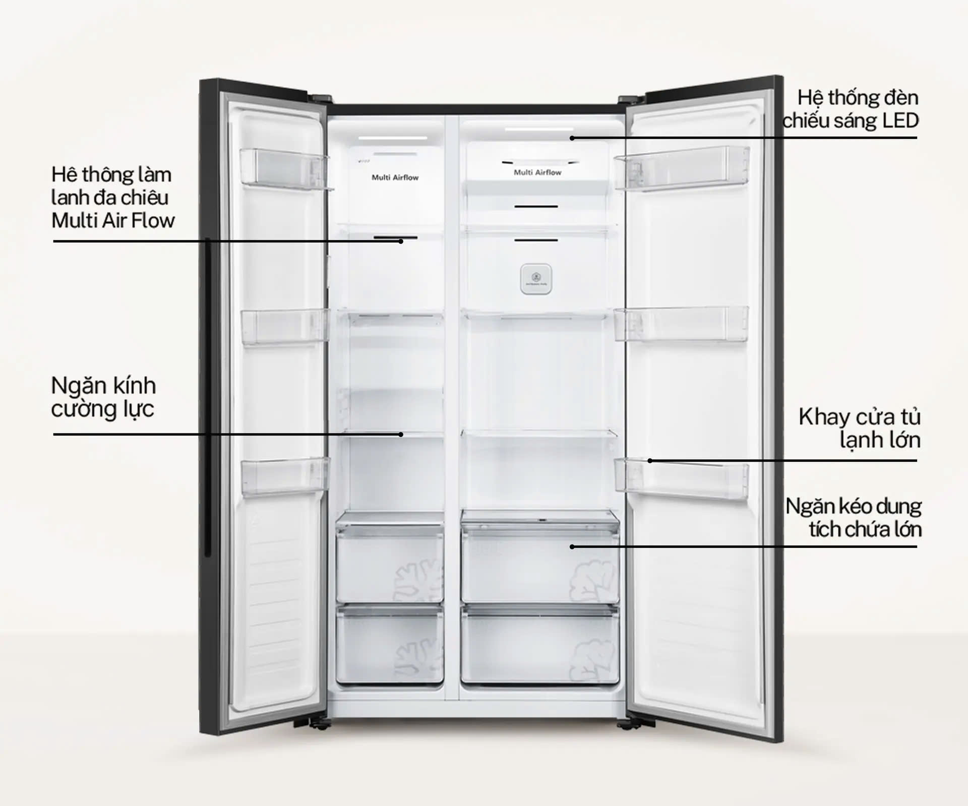 THÔNG TIN SẢN PHẨM - Kiểu tủ:Tủ lớn - Side by Side - 2 cánh - Dung tích sử dụng:519 lít - 4 - 5 người - Dung tích tổng:Hãng không công bố - Dung tích ngăn đá:185 lít - Dung tích ngăn lạnh:334 lít - Chất liệu cửa tủ lạnh:Mặt gương mờ - Chất liệu khay ngăn lạnh:Kính cường lực - Chất liệu ống dẫn gas, dàn lạnh:Ống dẫn gas bằng Đồng - Lá tản nhiệt bằng Nhôm - Năm ra mắt:2023 - Sản xuất tại:Trung Quốc Mức tiêu thụ điện năng - Công suất tiêu thụ công bố theo TCVN:520 kWh/năm - Công nghệ tiết kiệm điện:Inverter Công nghệ bảo quản và làm lạnh - Công nghệ làm lạnh:Luồng khí lạnh đa chiều Multi Air FlowCông nghệ 2 dàn lạnh độc lậpCông nghệ làm lạnh No Frost - Công nghệ bảo quản thực phẩm:Ngăn Moisture Fresh Crisper cân bằng độ ẩm - Công nghệ kháng khuẩn, khử mùi:Bộ lọc Anti Bacteria·Purify diệt khuẩn, khử mùi Tiện ích -