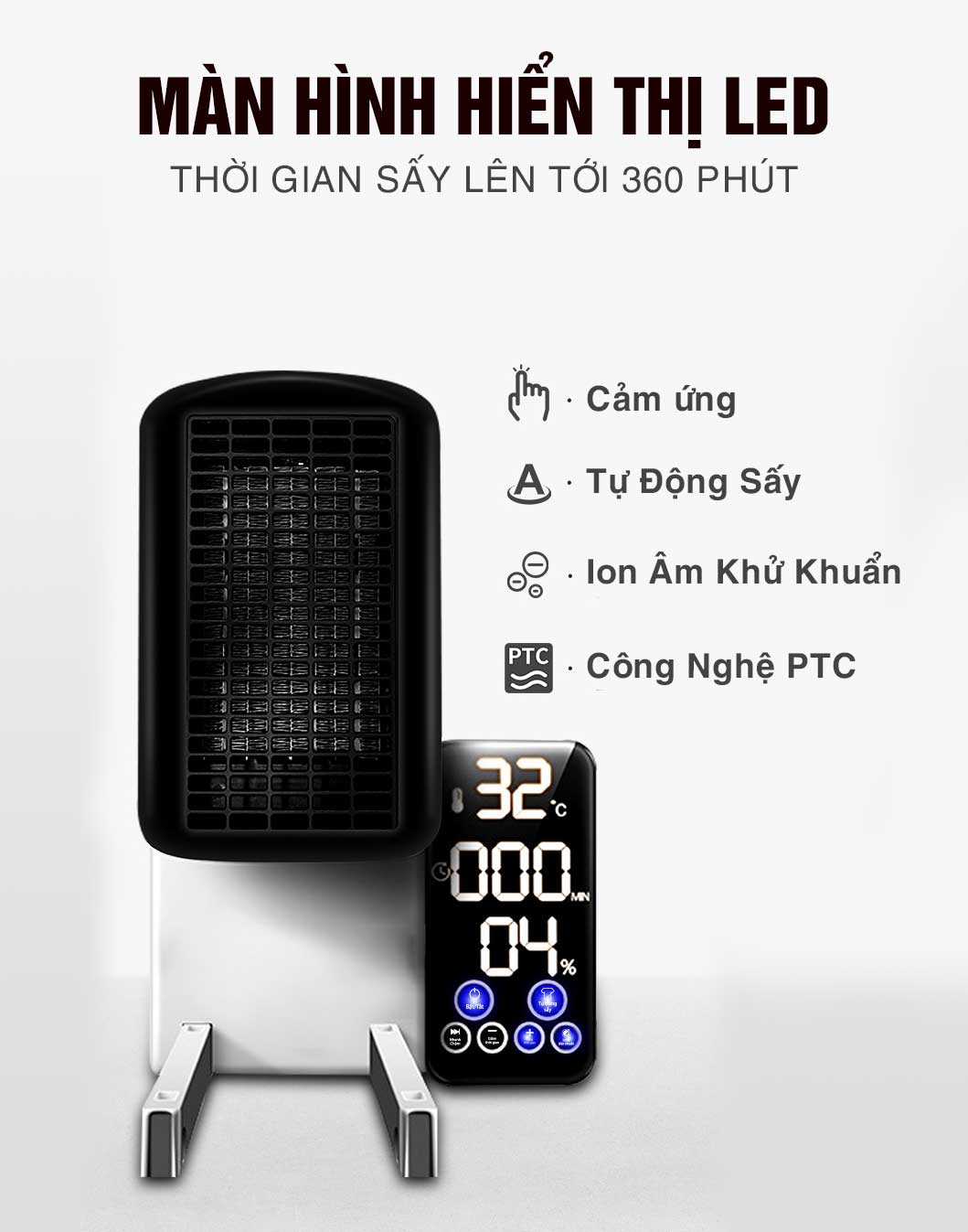 Thiết kế hiện đại, thông minh.          Tủ sấy quần áo Sowun SW 869 Được cấu tạo từ các thanh inox siêu bền, không gỉ, có thể gập lại dễ dàng mà không phải tháo gỡ lềnh kềnh khi không dùng đến giúp thu nhỏ diện tích, tiết kiệm không gian. Bên cạnh đó, thiết kế dạng tủ giúp người dùng có thể tận dụng tủ sấy như một chiếc tủ đựng quần áo tiện dụng.                         Sản phẩm có thiết kế thông minh. Bảng đèn LED kết nối với động cơ sấy hiển thị rõ ràng, dễ dàng điều khiển, lựa chọn các chức năng phù hợp                         Bánh xe đẩy linh hoạt giúp bạn thuận tiện di chuyển tới mọi vị trí bạn muốn, đồng thời bộ phận chống trượt ở bánh xe  giúp cố định sản phẩm khi cần.           Phương pháp sấy tĩnh cho quần áo luôn phẳng phiu.         Máy sấy quần áo SW 869 sử dụng phương pháp làm khô tĩnh học, làm khô từ nhiệt đối lưu giúp quần áo được sấy khô nhanh, bên cạnh đó máy có tích hợp chức năng bảo vệ khi quá nhiệt giúp giữ quần áo không nhăn, không mài mòn, bền hơn.                               Linh hoạt sử dụng.         Tủ có đa dạng chế độ sấy Tắt/Bật, Nhanh/chậm, ion hoá, Sấy tự động.  Cài đặt thời gian                          Tính năng ion hoá diệt khuẩn hiệu quả.          Ở chiếc tủ sấy Sowun SW 869 được thiết lập cơ chế ion hoá, giúp tiêu diệt hết các vi khuẩn bám trên quần áo.  Thiết kế màng chống bụi bảo vệ mô tơ hoạt động hiệu quả.         Mô tơ sấy được trang bị tấm chắn bụi phía dưới đáy giúp bảo vệ mô tơ khỏi các tác nhân gây chập, cháy và cho phép mô tơ hoạt động ổn định hơn, tuổi thọ sản phẩm cũng cao hơn.                       Động cơ sấy với công suất sấy vô cùng lớn, khả năng sấy khô lên tới 30 kg quần áo         Máy sấy quần áo Sowun SW 869 có công suất sấy cực kỳ lớn đạt 1600W, cho việc sấy khô quần áo nhanh hơn gấp nhiều lần. Đặc biệt, với máy sấy SW 869 cho phép lượng quần áo cần sấy lên tới 30kg, hơn gấp 2 lần so với những chiếc máy sấy thông thường.