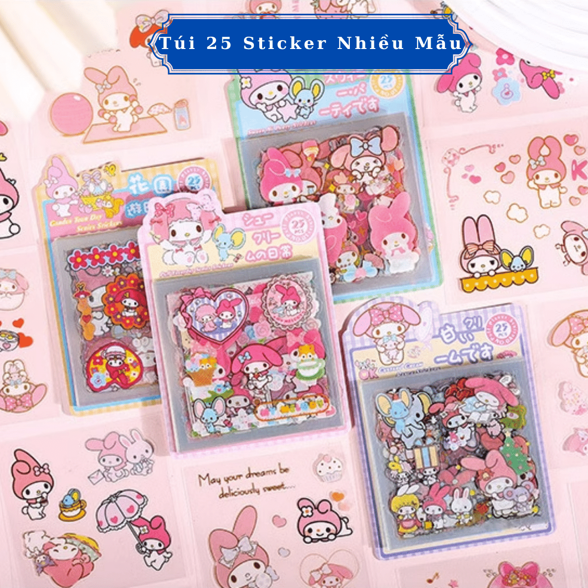 Túi 25 Tờ Sticker Sanrio, Gấu Dâu, Cinnamoroll, Thỏ Tai Hồng (Đã Cắt Sẵn)