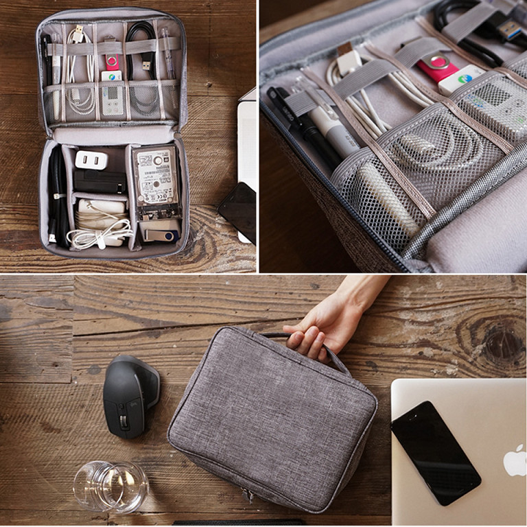 • Khóa kéo hai chiều tiện dùng, trên túi có trang bị sẵn một quai sách, đây có thể coi như một vali mini chuyên đựng các phụ kiện công nghệ.