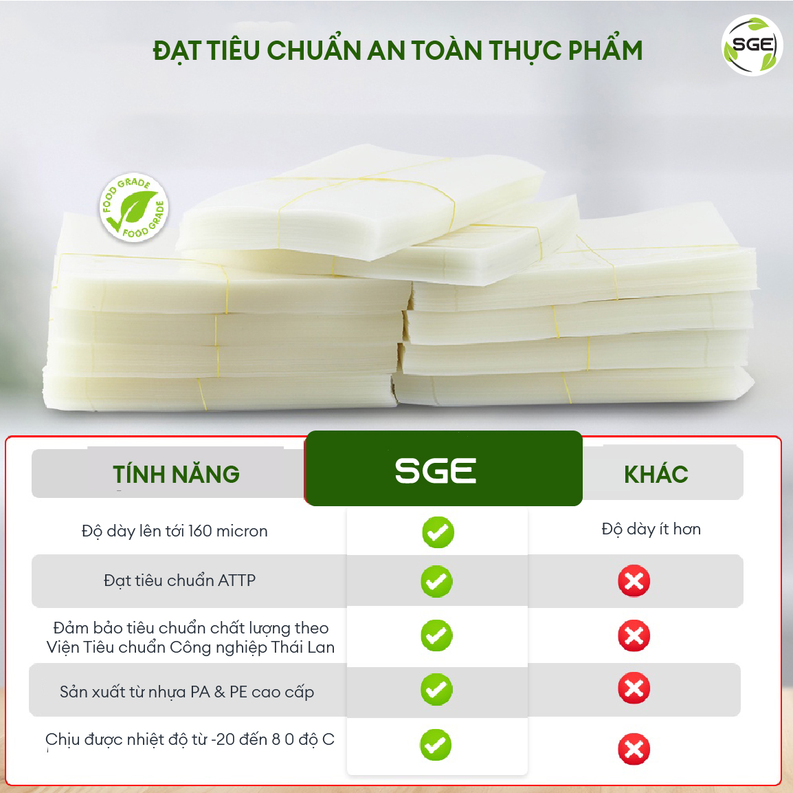 Túi hút chân không (Vacuum sealer bag) thương hiệu SGE của Thái Lan là sản phẩm sử dụng kèm với máy hút chân không. Chất lượng tốt, dẻo dai, dày dặn, chịu được nóng và lạnh. Bảo vệ thực phẩm từng bước bằng lớp nhựa đạt tiêu chuẩn an toàn thực phẩm.