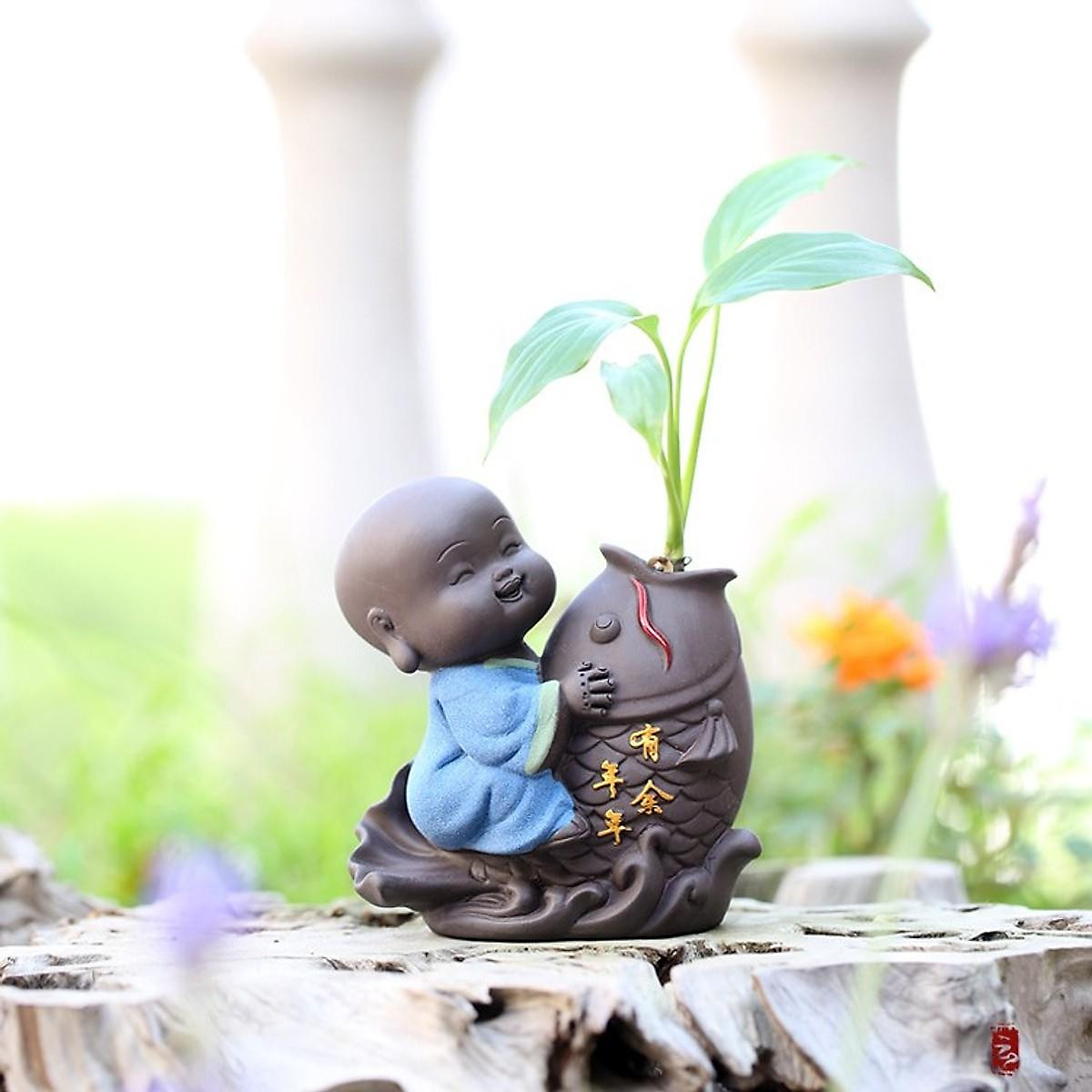 ✨Tượng chú tiểu cưỡi cá chép - trồng cây, cắm hoa để bàn