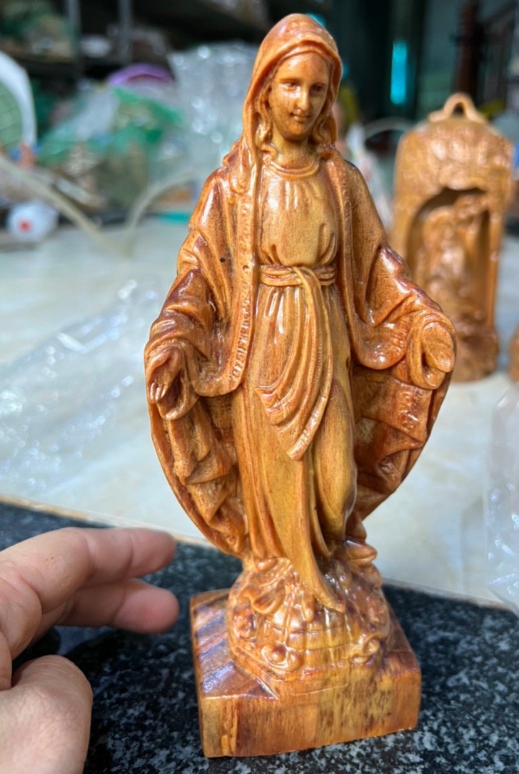 Tượng đức mẹ ban ơn được làm bằng chất liệu gỗ huyết long liền khối tự nhiên 100% Kt cao 20×8×6cm _ Tượng đức mẹ ban ơn được điêu khắc trạm trổ vô cùng tỉ mỉ , tinh sảo kỳ công .Đi hầu hết tất cả mọi chi tiết góc ngách nội dung hoa văn của tượng đều được gọt tỉa chỉnh sửa hoàn toàn bằng tay thủ công .Tượng được làm và hoàn thiện ,do bàn tay khối óc tài hoa ,Từ những người thợ dầy rặn kinh nghiệm ,cũng như tay nghề cao trong làng nghề truyền thống .Chính vì thế tượng đức mẹ ban ơn đã đáp ứng đầy đủ mọi tiêu tiêu cần thiết như ( Đẹp bền rẻ ) Thẩm mỹ nghệ thuật với chất lượng tuyệt vời
