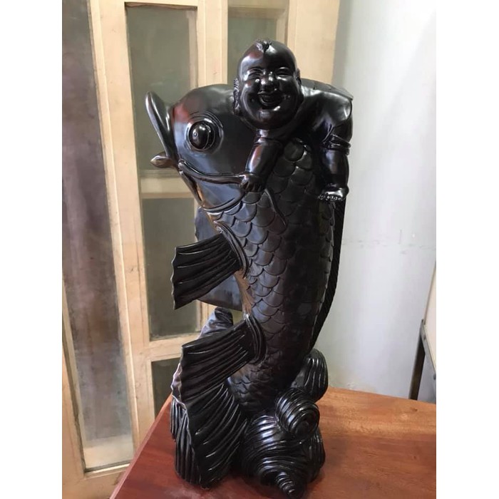 Tượng Gỗ Mỹ Nghệ Cá Chép Há Miệng To hút Tài Lộc cõng em bé cười quá dễ thương trên lưng Gỗ gõ màu đen huyền Size Size cao 50cm x ngang 20cm x sâu 15cm Anh Chị trưng trang trí trên bàn nhà, công ty đẹp ạ