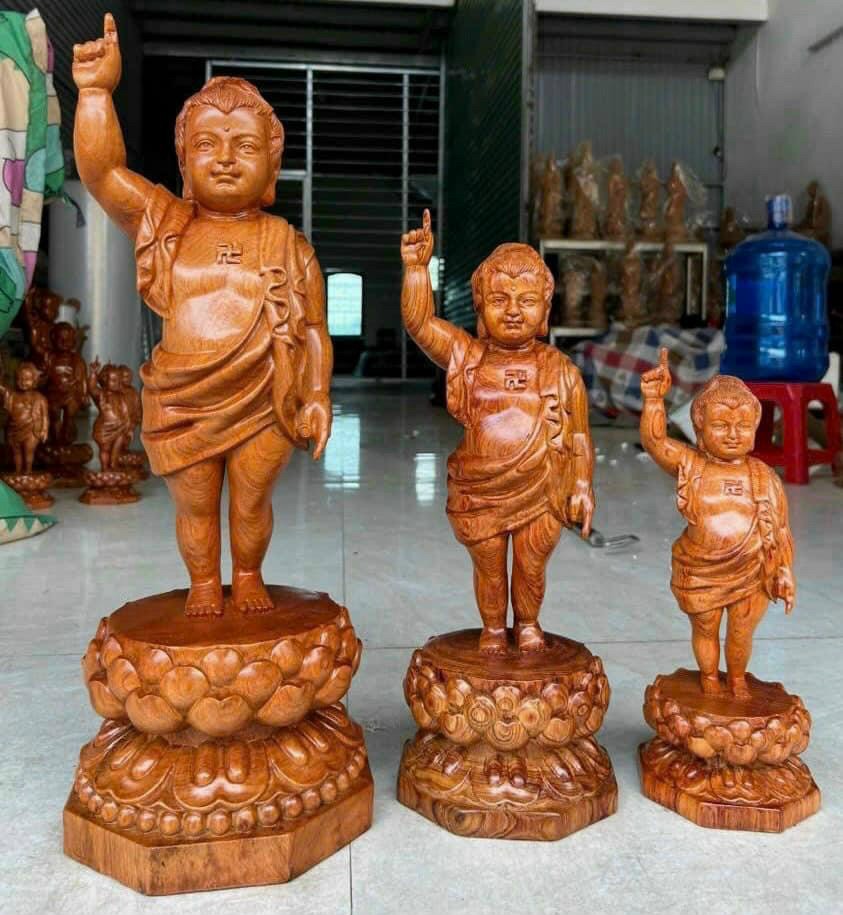 Tượng phật đản sanh được làm bằng chất liệu gỗ hương đá liền khối tự nhiên 100% Kt cao 30×12×12cm _ Tượng được chạm khắc gọt tỉa vô cùng ti mi tinh xảo kỳ công Đi hầu hết tất mọi chi tiết góc ngách nội dung hoa văn của tượng đều được gọt tỉa chỉnh sửa sắc nét hoàn toàn bằng tay thủ công. TƯỢNG CHẾ TÁC LÀM VÀ HOÀN THIỆN TỪ BÀN TAY KHỐI ÓC TÀI HOA VÀ NHỮNG NGƯỜI THỢ GIÀU KINH NGHIỆM CŨNG NHƯ TAY NGHÊ CAO TRONG LÃNG NGHÊ TRUYỀN THỐNG