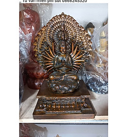 Tượng phật thiên thủ thiên nhãn ,ngài nghìn mắt nghìn tay được làm bằng chất liệu gỗ hương đá tự nhiên 100%  Kích thước cao tổng tính cả lá hào quang 30cm ngang mặt 20cm sâu 15cm _ Tượng thiên thủ thiên nhãn được trạm khắc vô cùng tỉ mỉ ,tinh sảo kỳ công đi hầu hết tất cả mọi chi tiết góc ngách nội dung hoa văn của tượng đều được gọt tỉa ,chỉnh sửa hoàn toàn bằng tay thủ công .Đồng thời tượng được kiểm định kỹ lưỡng ,khắt khe như cho vào thẩm ,sấy cho gỗ khô kiệt .Mục đích trống dập nứt vênh mo mối mọt ,kết hợp với trà nhám đánh giấy giáp nhiều nước ,sờ mát lạnh ,Rồi cho vào phun lót làm bóng mờ để giữ lại mầu sắc vân gỗ tự nhiên ,Cũng như tô làm mầu giả cổ như ảnh trên ,Tượng được làm và hoàn thiện do bàn tay khối óc tài hoa ,Từ những người thợ giàu kinh nghiệm cũng như tay nghề cao trong làng nghề truyền thống ,Chính vì thế tượng đã đáp ứng đầy đủ mọi tiêu trí ( Đẹp bền rẻ ) Thẩm mỹ nghệ thuật với chất lượng tuyệt vời