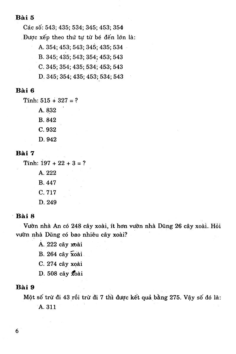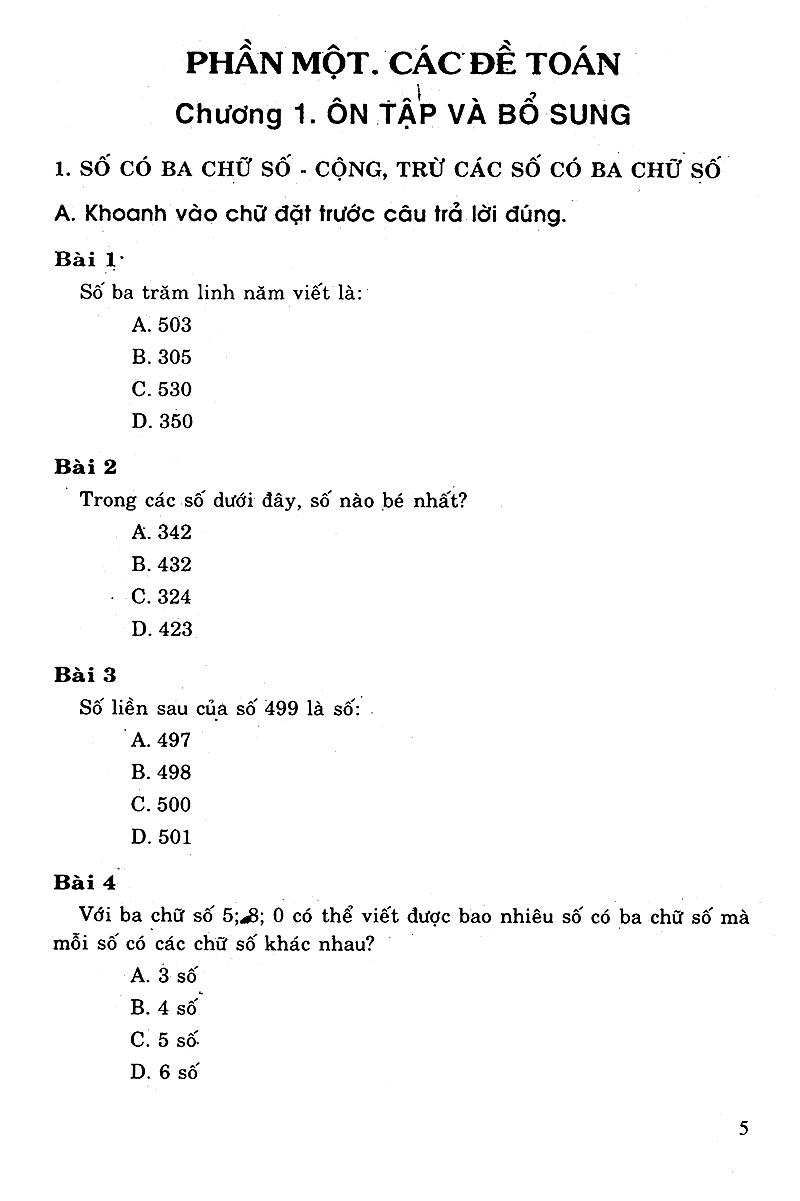 Phần thứ nhất chúng tôi giới thiệu các đề toán dưới nhiều dạng trắc nghiệm như: trắc nghiệm nhiều lựa chọn, trắng nghiệm điền khuyết, trắc nghiệm đúng, Các bài tập được sắp xếp theo cấu trúc chương trình Toán 3 để học sinh tiện sử dụng trong suốt quá trình học tập của năm học.