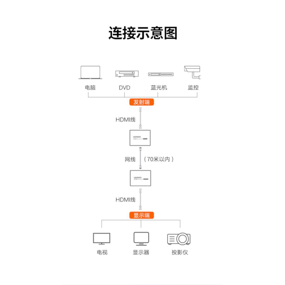 Bộ kéo dài HDMI 70M qua cáp mạng Ugreen 20519 bao gồm một đầu phát (Sender) và một đầu nhận (Receiver), với tín hiệu HDMI Input/Output hỗ trợ FullHD 1080P@60Hz nối ghép với nhau bằng đoạn cáp mạng cat5e/6 dài tối đa lên đến 70m. Giải pháp thay thế cáp HDMI bằng cáp mạng này giúp bạn hoàn toàn có thể yên tâm khi đi các hệ thống dây âm tường, đi dây cự ly xa, và giảm chi phí thi công, bảo trì…