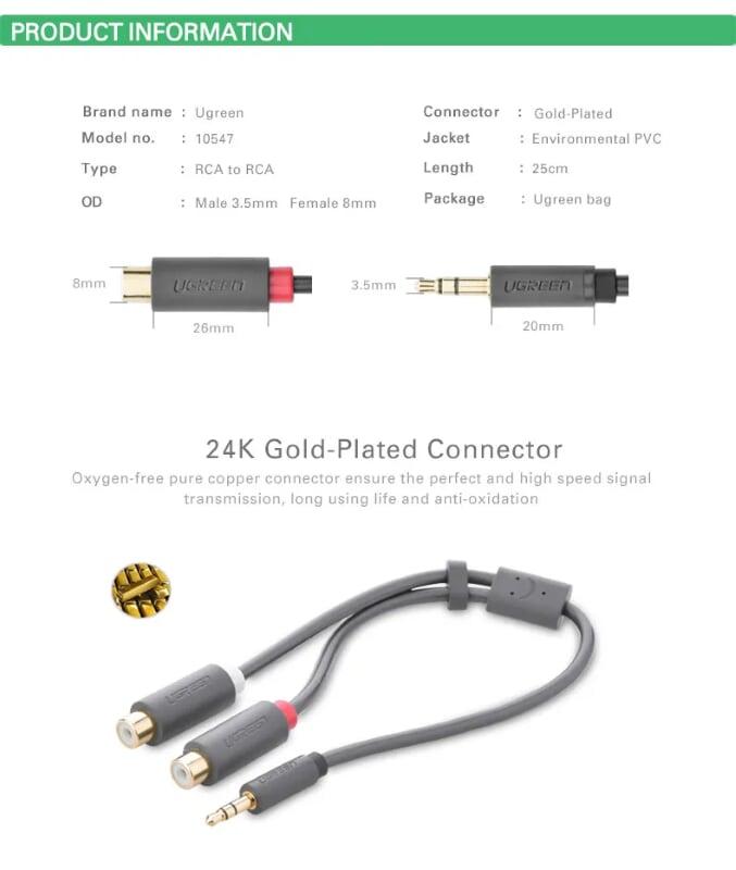 Ugreen 10591 3.5Mm Male To 2Rca Male Cable 5M 1. Features: 3.5mm to 2 RCA audio converter cable 2. Length: 5M 3. Color: Black 4. Input: 3.5mm audio jack (AUX) 5. Output: 2 RCA L