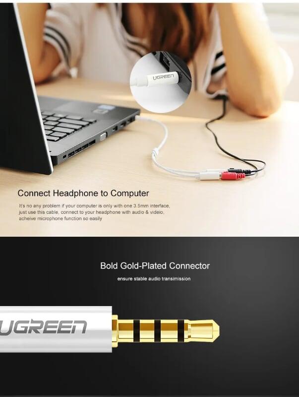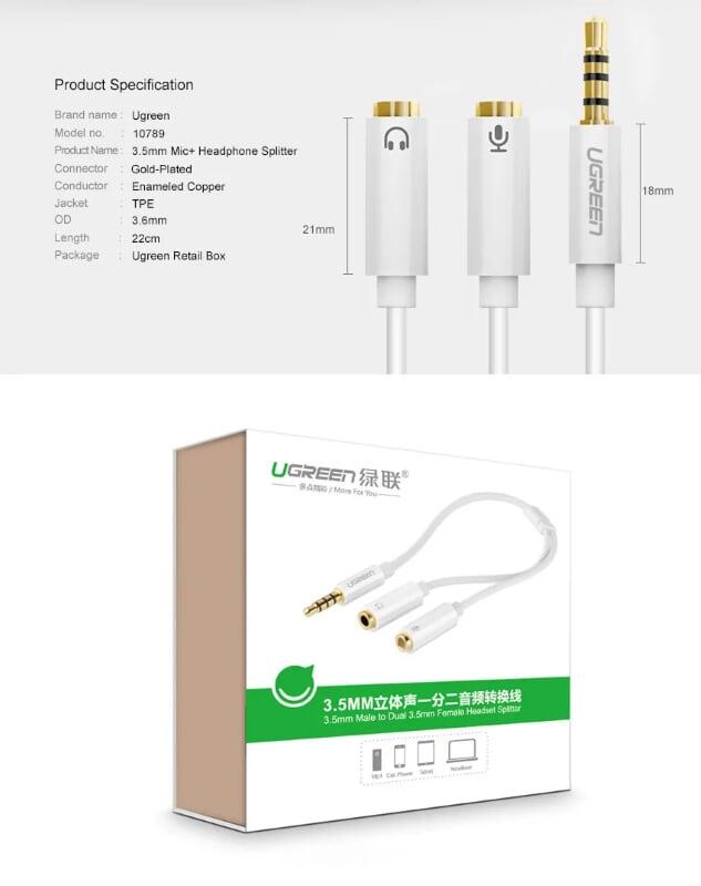 Ugreen 10532 3.5Mm Male To 3.5Mm Female ×2 Metal Connectors Gold Plated 20Cm AV123 1. Features: split 3.5 audio port from 1 to 2 ports 2. Cable length: 20 CM 3. Color:Black Gray 4. Input: