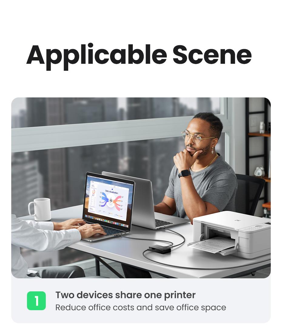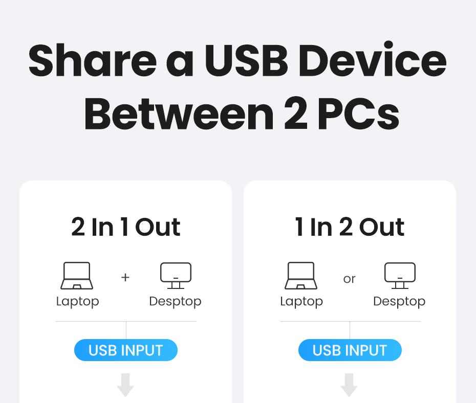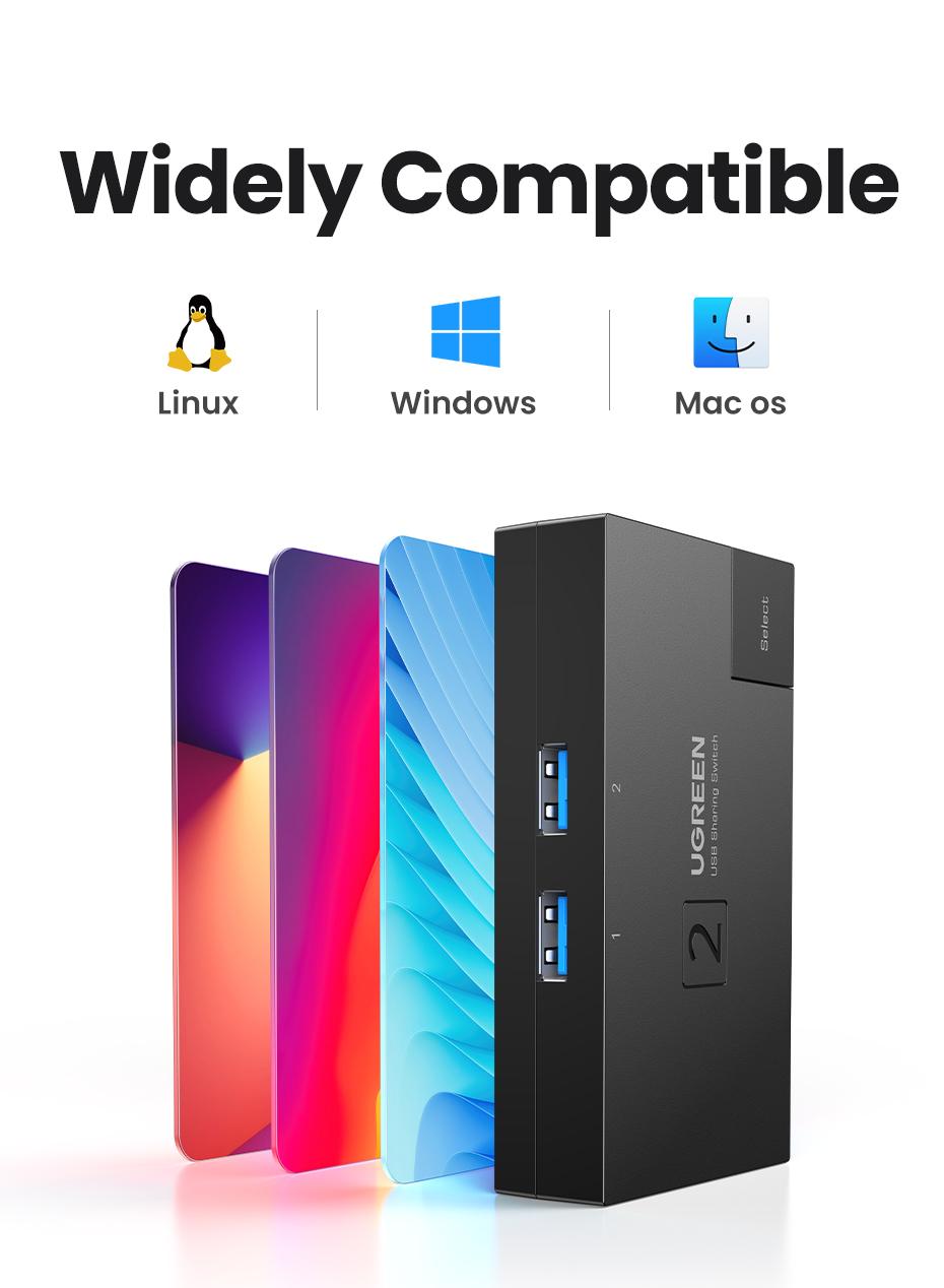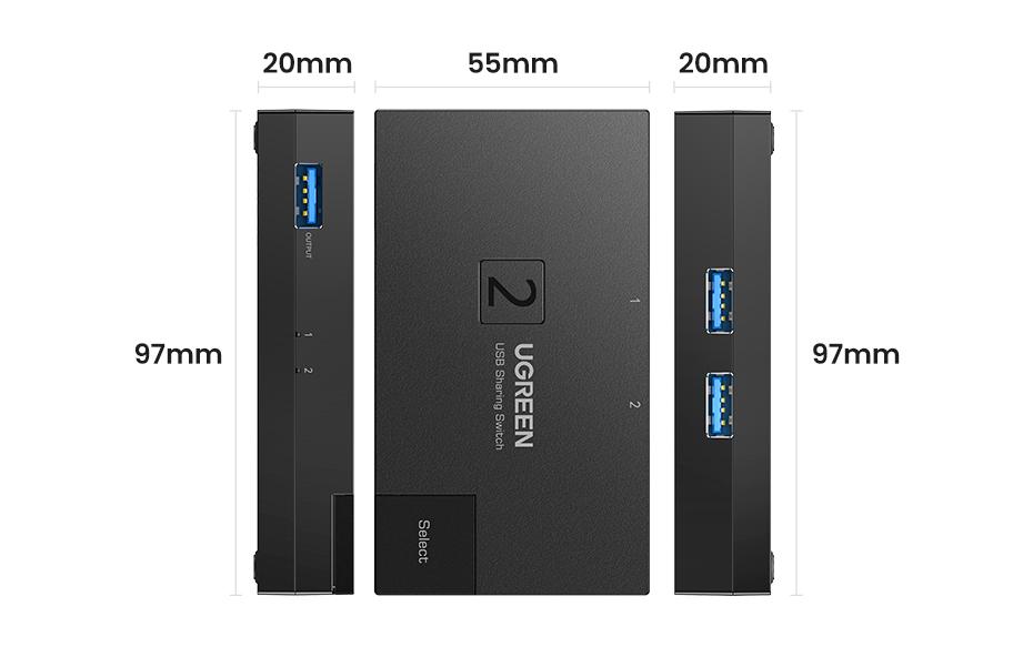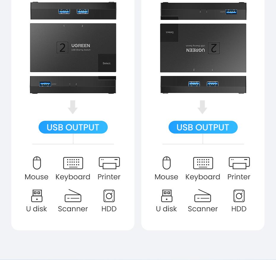 Ugreen 30768 2 in 4 out usb2.0 sharing switch box usb 3.0 us216 1. Two computer can use 4 same USB device simultaneously 2. USB 3.0 3. 280g 4. 25 x 15 x 5 cm