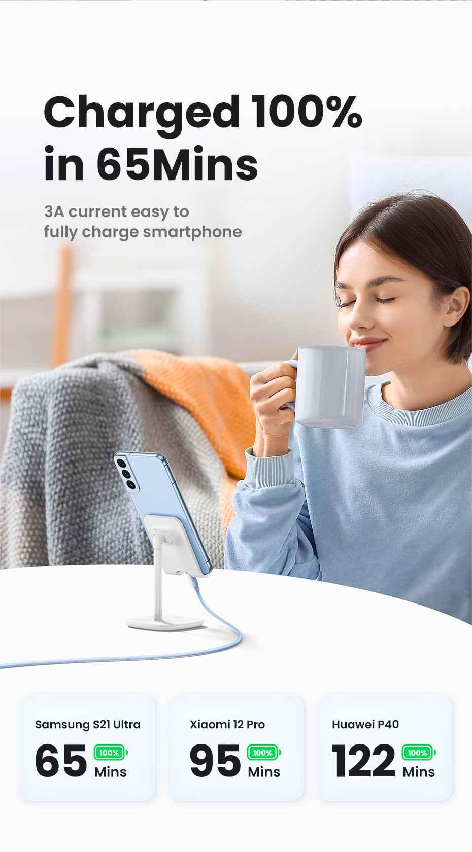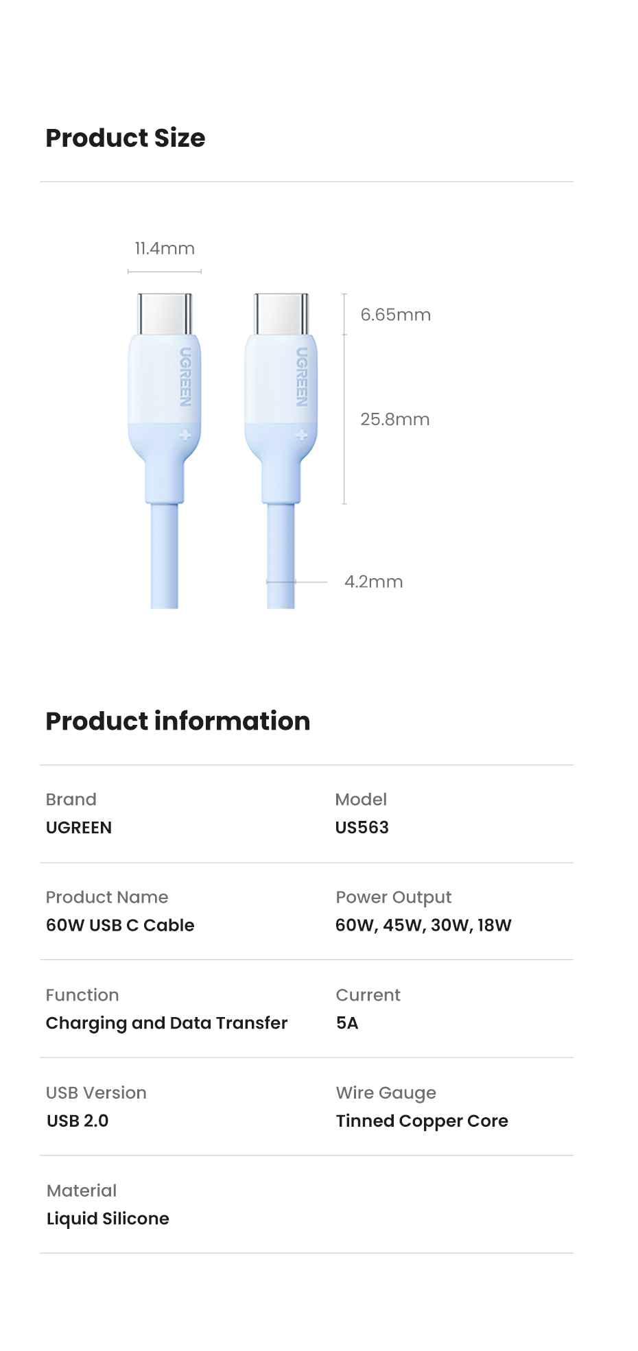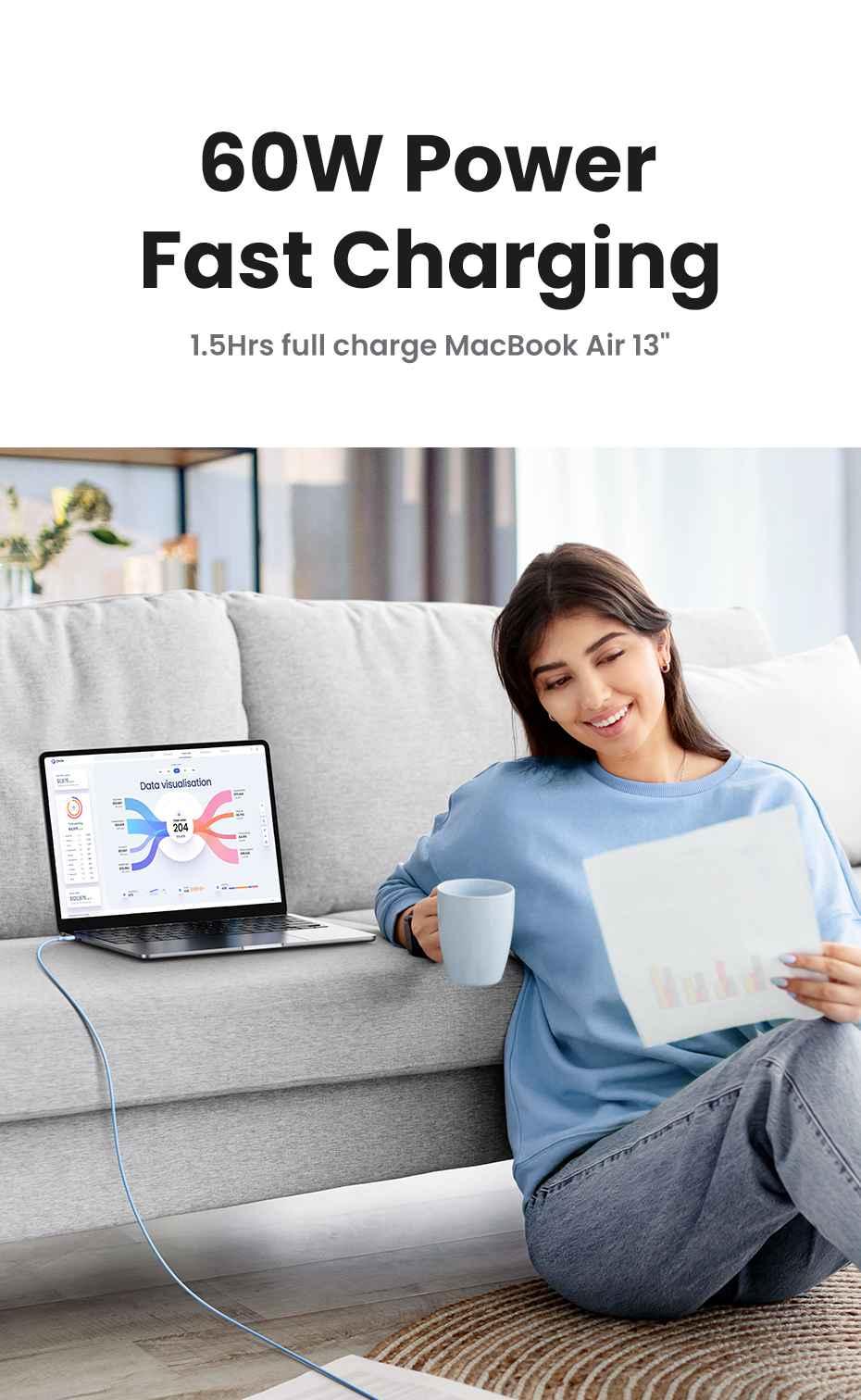 1. The USB C to USB C Power Cable delivers max 60W(20V/3A) fast charging to Type C/Thunderbolt 3 laptops/tablets/phones, when paired with 96W/87W/65W/45W/18W USB Power Delivery charger. Fully recharge MacBook Air 13" in 1.5h, as