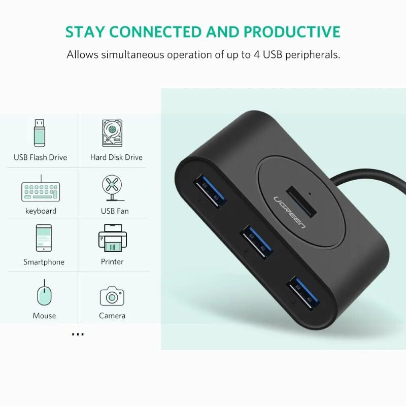 Ugreen 20277 1m 4 ports usb 2.0 hub with micro usb power port màu đen cr106 1. Input : USB-A 2. Output : 4 Port USB 2.0 . 3. Color : Black 4. Length :