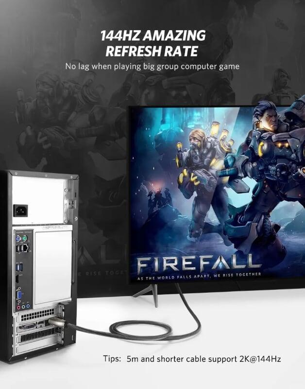 1. 1-2M: 30AWG;3M: 28AWG 2. Wire Core: tin-plated oxygen-free copper 3. Support 3D/HDR/HDCP 4. Resolution: 1080P@240Hz/2K@165Hz/4K-144Hz/8K@60Hz 5. Multiple internal shielding 6. Support mirror mode and extend mode 7. Support ATI eyefinity multi split-screen mode 8.