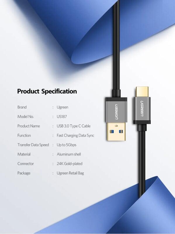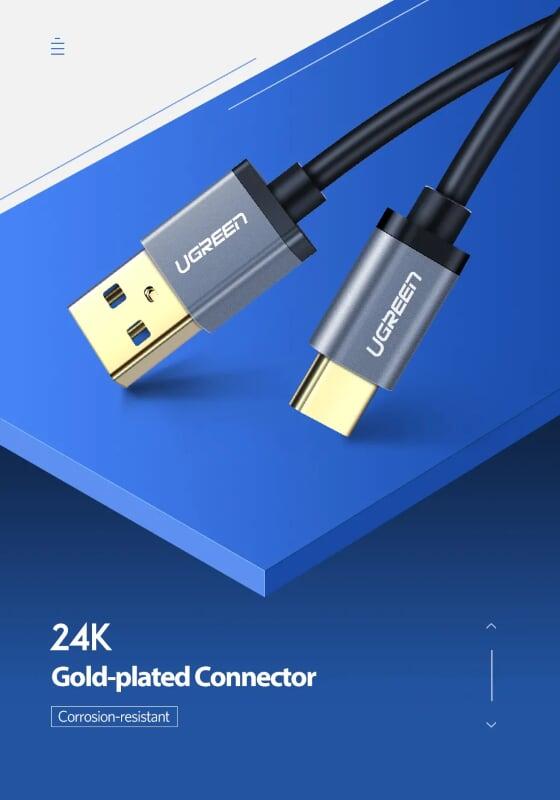 Cáp sạc nhanh & truyền dữ liệu Ugreen USB-A 3.0 sang Type-C màu đen US187 - chube.vn