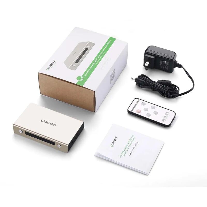 Ugreen 40369 Hdmi 3*1 Switch With 3.5Mm + Spdif Zinc Alloy Mm128 1. Features: Sharing a screen, a projector for 3 devices. 2. Input: HDMI x3 3. Output: HDMI x1, Optical Toslink x1, Audio 3.5mm