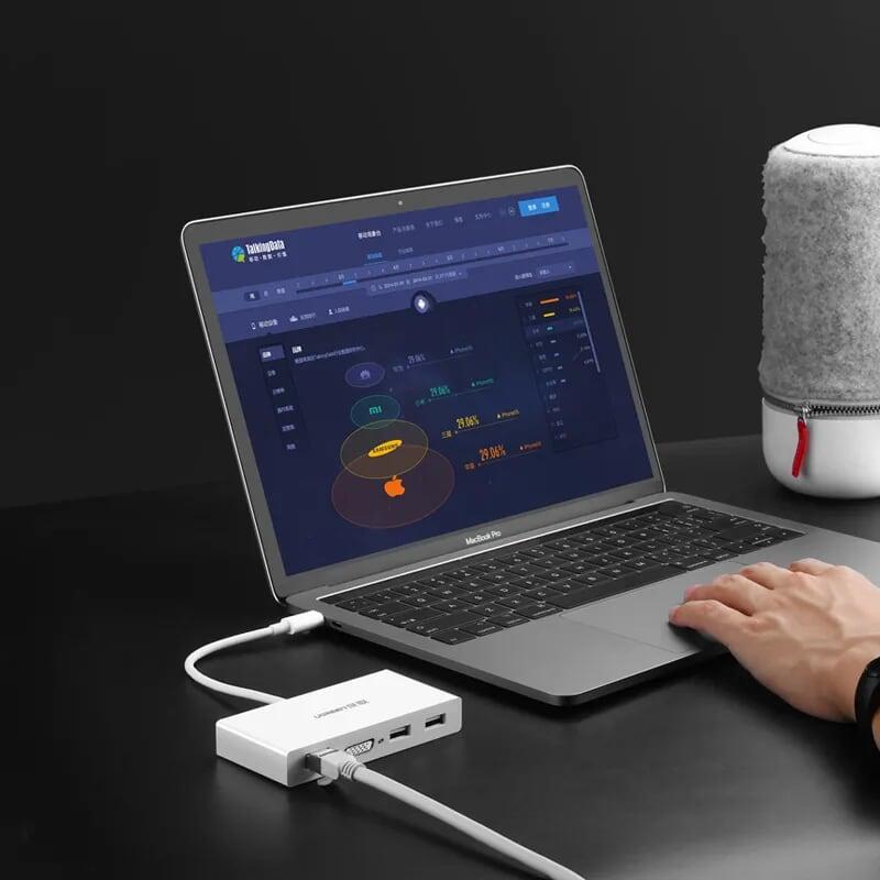 ✨Ugreen UG40378MM135TK 15CM màu Trắng Bộ chuyển đổi TYPE C sang 2 USB 3.0 + VGA + LAN bọc nhựa ABS - HÀNG CHÍNH HÃNG