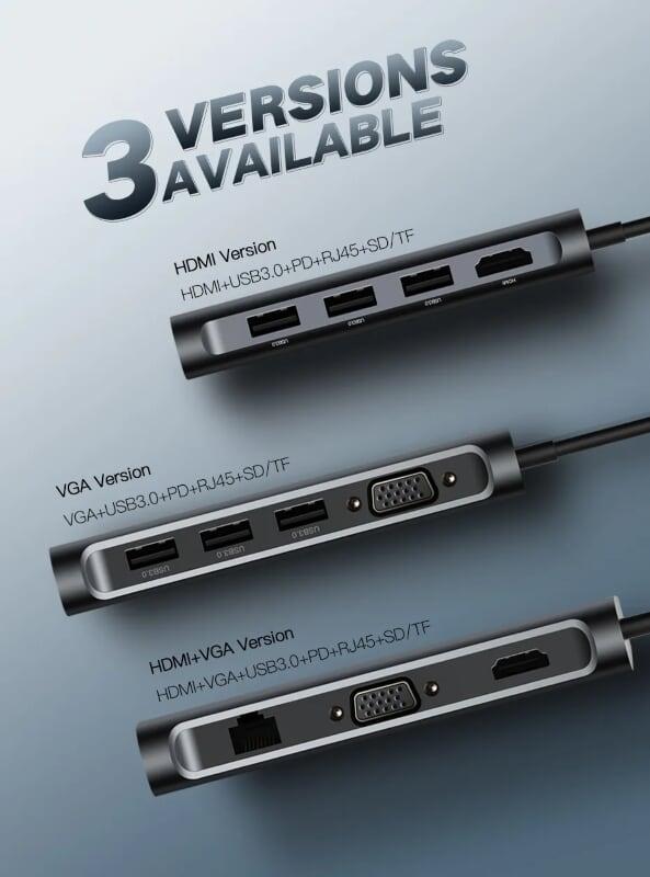 - Feature: Converting a positive USB-C to 1 VGA + 1 HDMI + 3 USB 3.0 + 1 RJ45 1Gbps + 1 SD + 1 Micro SD card slot with USB-C Power PD port.