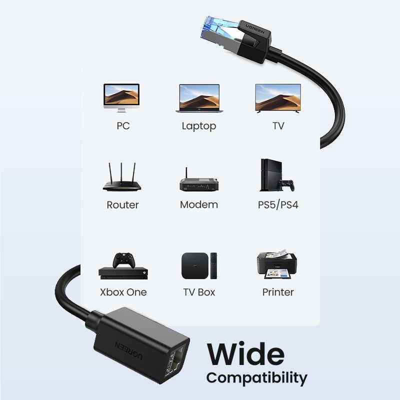 Cáp nối dài mạng LAN CAT 8 dài 1m Ugreen 50199 có thể tương thích hoàn hảo với máy tính, máy tính xách tay, modem, bộ định tuyến, PS5, PS4, PS3, X-Box 360, X-Box One, thiết bị chuyển mạch mạng, ADSL, bộ điều hợp mạng, trung tâm và các mạng khác thiết bị có đầu nối RJ45. Nó cũng có thể hoàn toàn tương thích ngược với Cat7, Cat6e, Cat6, Cat5e, Cat5.