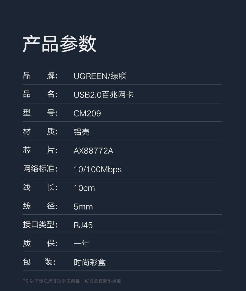 1. Hãng : Ugreen 2. Mã sản phẩm : 50921-CM209 3. Màu : Gray 4. Chiều dài cáp : 10CM 5. Đầu vào: USB 2.0 Male 6. Đầu ra: RJ45 Female 7. Chipset : AX88772A
