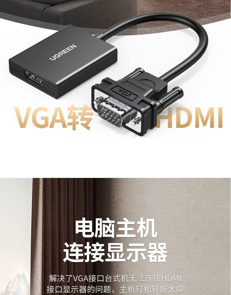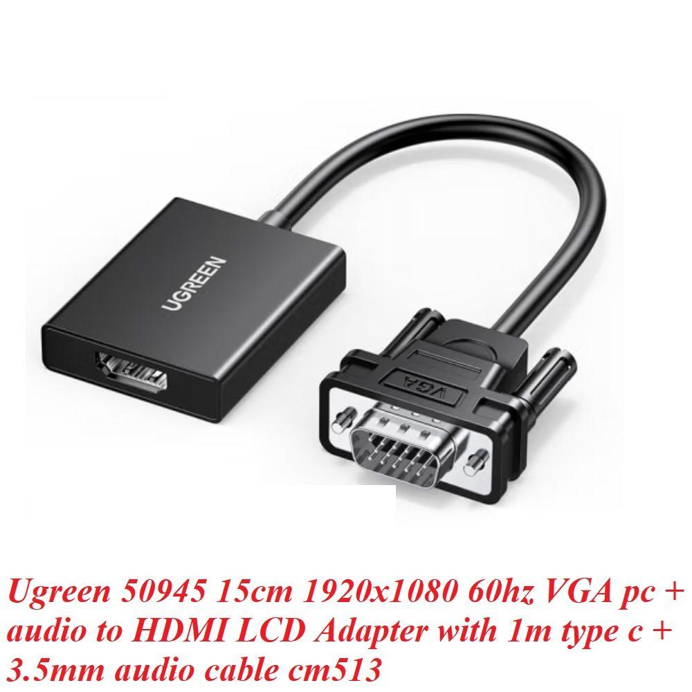 ✨Ugreen UG50945CM513TK 15CM 1920x1080 60Hz Bộ chuyển đổi VGA sang HDM kèm cáp nguồn USB-C dài 1M + cổng 3.5mm Màu Đen - HÀNG CHÍNH HÃNG