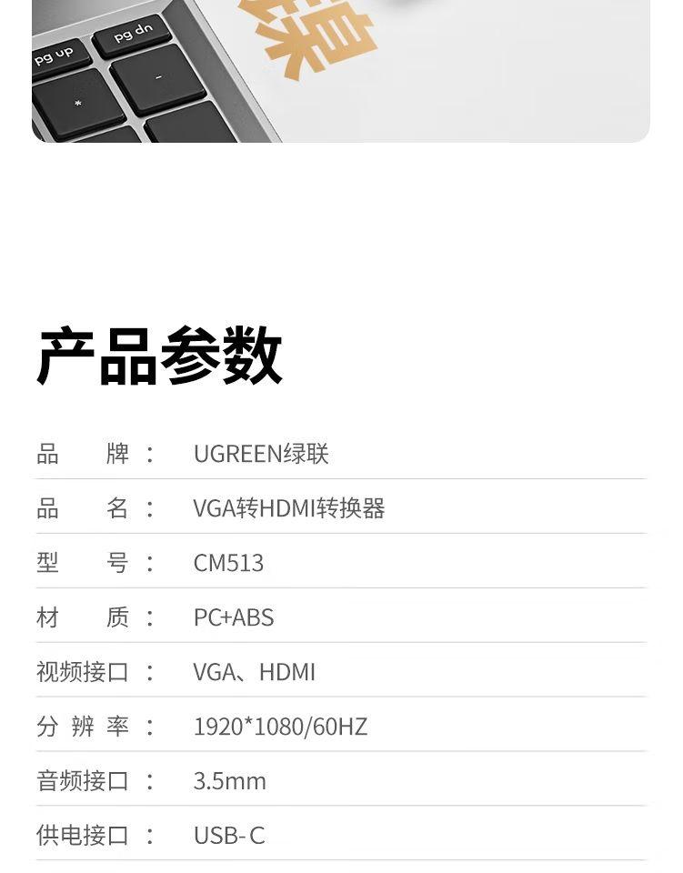 1. Input: VGA Male 2. Output: HDMI Female 3. Audio input: 3.5mm stereo port,Sampling rate up to 24bit 32kHz/44.1kHz/ 48kHz 4. Power supply: USB-C 5V/1A 5. Support resolution up to 1080P@60Hz *When the resolution is