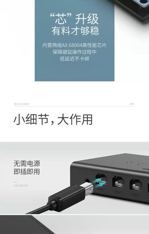 Ugreen 30767 2 in 4 out usb2.0 sharing switch box usb 2.0 us216 1. Two computer can use 4 same USB device simultaneously 2. USB 2.0 3. 280g 4. 25 x 15 x 5 cm