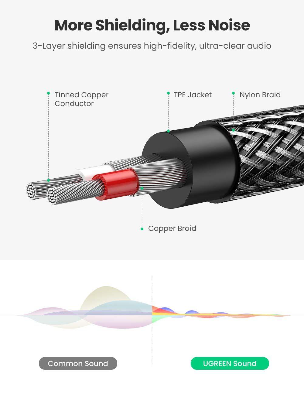 1. Connector A: 1 x 3.5mm Jack Male 2. Connector B: 2 x RCA Female, White (Audio left) Red (Audio right) 3. Cable Material: Nylon Braided 4. UGREEN 3.5mm(1/8" headphone plug) to 2 RCA(Right/Left) stereo
