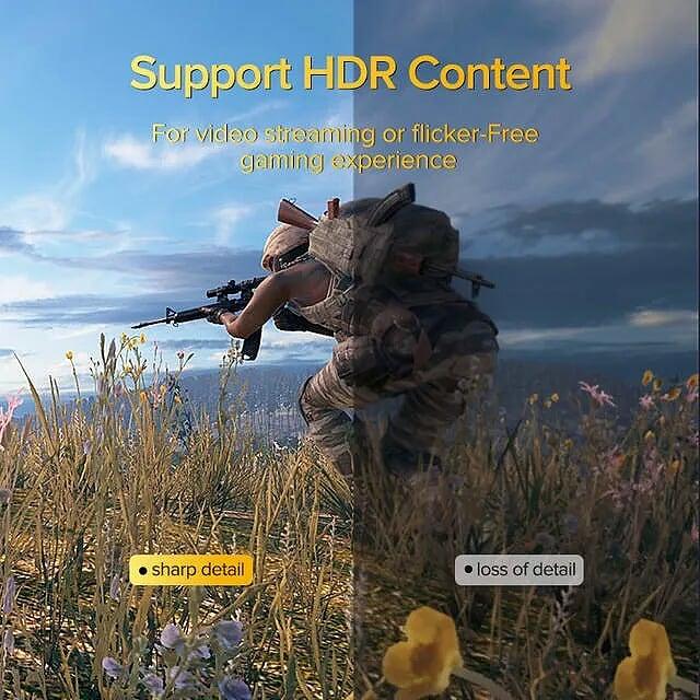 1. 8K resolution support at 60Hz and 4K resolution support at 120Hz for high-definition video and audio. 2. HDR (High Dynamic Range) support for improved color depth, contrast, and brightness. 3. Plug-and-play design, no additional
