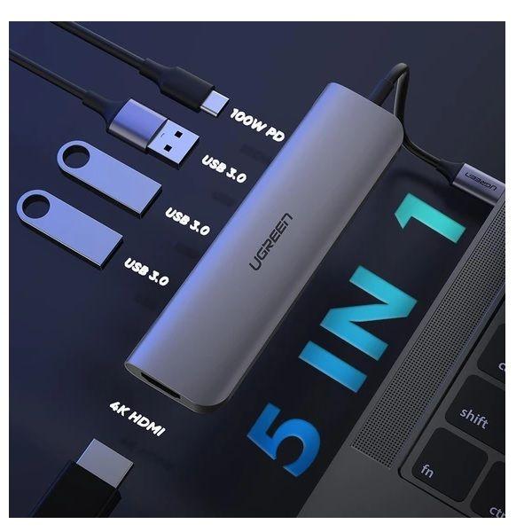 Hub USB Type-C 5 trong 1 ra HDMI 4K@30Hz, USB 2.0, USB 3.0, Sạc PD 100W Ugreen 15495 cao cấp| SUNPC