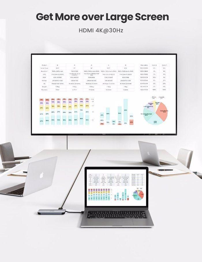 1. Hub đa năng 6 trong 1 Ugreen 80129 giúp bạn mở rộng từ 1 cổng USB Type C sang các cổng khác như HDMI, USB 3.0, khe đọc thẻ nhớ. Giúp bạn kết nối
