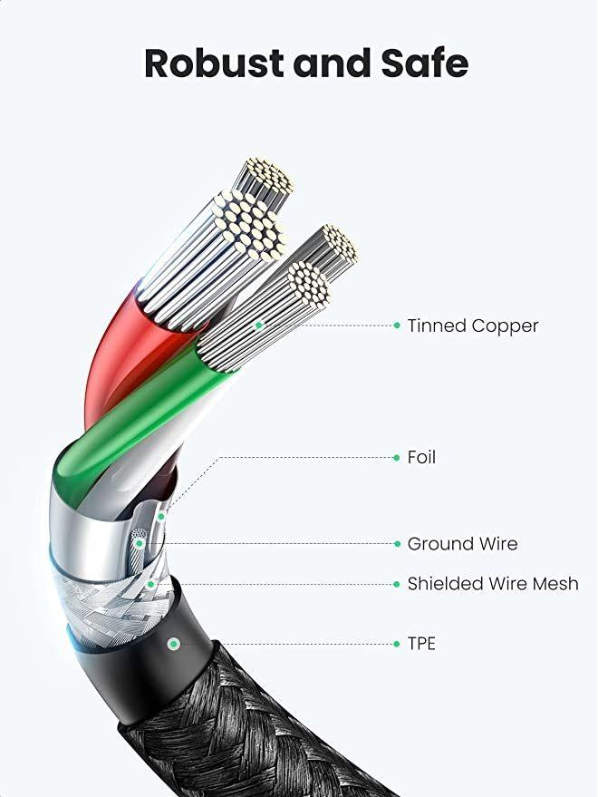1. Connector A: 1 x 3.5mm Jack Male 2. Connector B: 2 x RCA Female, White (Audio left) Red (Audio right) 3. Cable Material: Nylon Braided 4. UGREEN 3.5mm(1/8" headphone plug) to 2 RCA(Right/Left) stereo