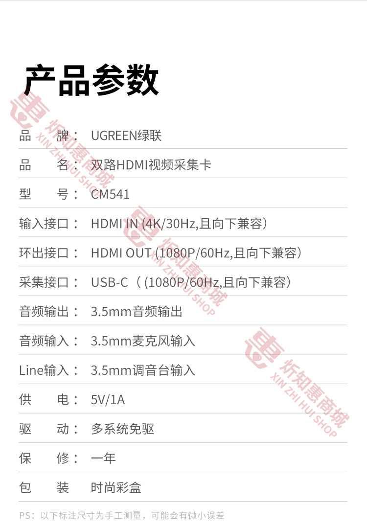 1.Input: HDMI IN (4K@60Hz Max) 2.Capture port: USB-C+A (1080P@30Hz) 3.USB-C+A: theoretical transfer speed of USB 2.0 is 480Mbps 4.Sampling rate: 24bit/48KHz 5.SNR: ≥90dB 6.THD: <-80dB 7.Operating systems: Windows 8.1/ 10/macOS/Linux/Android 5.0 and higher 8. Compatible