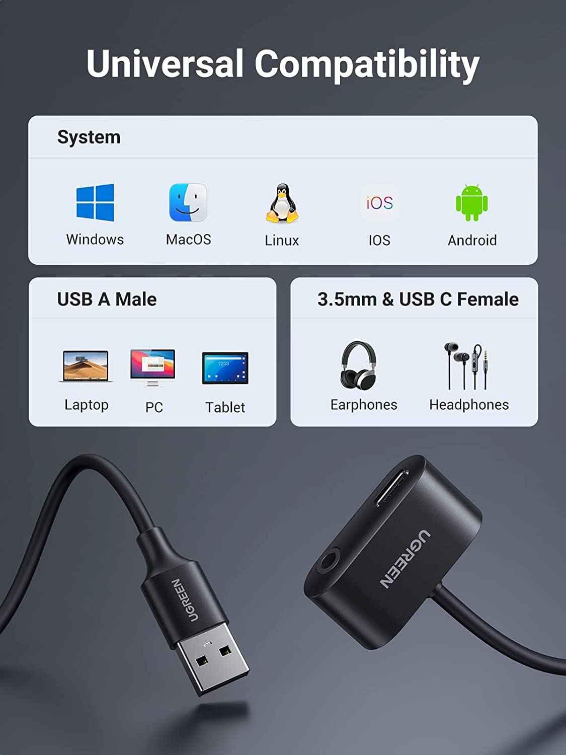 Ugreen 30712 usb external stereo sound adapter us206 1. Specifications Computer Connector: USB 2.0 Male Headset Connector: 3.5mm TRRS Female 2. Cable Length:15cm 3. Chipset: C-Media 4. Hỗ Trợ Mic và Tai Nghe 5. Màu: