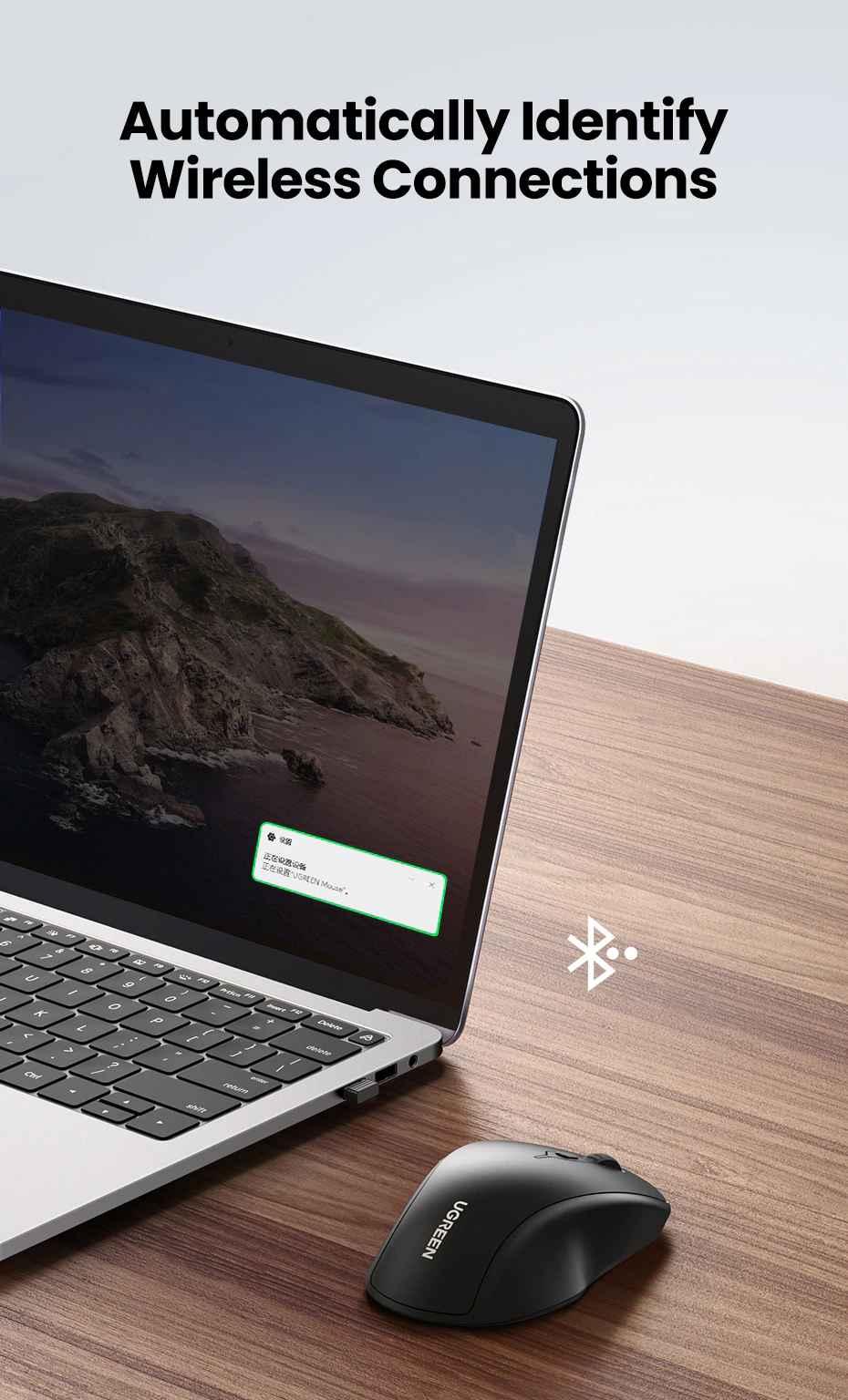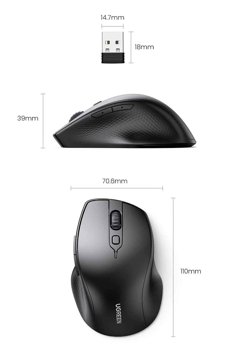 1. Brand: Ugreen 2. Product name: Wireless mouse + Bluetooth 3. Model: 90855 - MU006 4. Color : Black 5. Connection method: 2.4G wireless (USB receiver) + Bluetooth 5.0 6. Working distance: 15 meters 7.