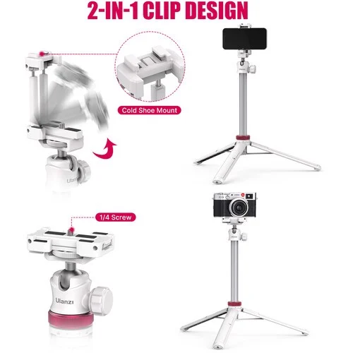 - Thiết kế 2 trong 1: vít tiêu chuẩn 1/4 inch để lắp máy ảnh, kẹp điện thoại gấp và ẩn, mở ra khi cần sử dụng.