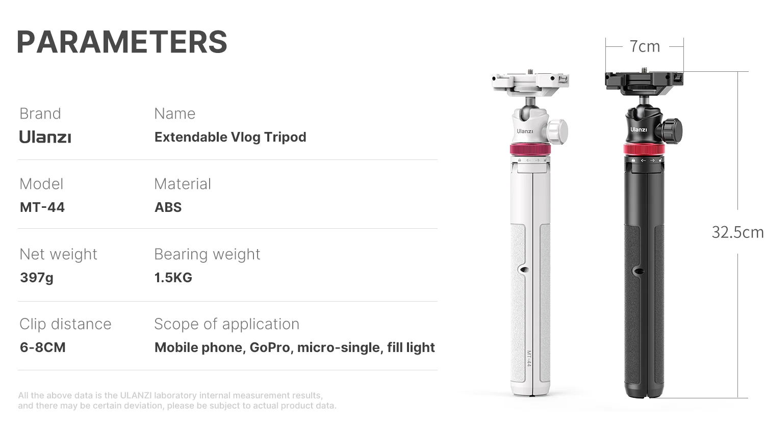 - 01 Chân đế tripod Ulanzi MT-44 THÔNG SỐ KỸ THUẬT MaterialABSNet Weight 397gBearing Weight 1.5 kgClip Distance6-8cmScope of applicationMoblie Phone, Gopro, micro-single, fill light Keyword:Ulanzi MT-44, tripod máy ảnh, tripod điện thoại, tripod cầm tay, tripod du lịch, tripod để bàn, tripod giá rẻ, tripod Ulanzi