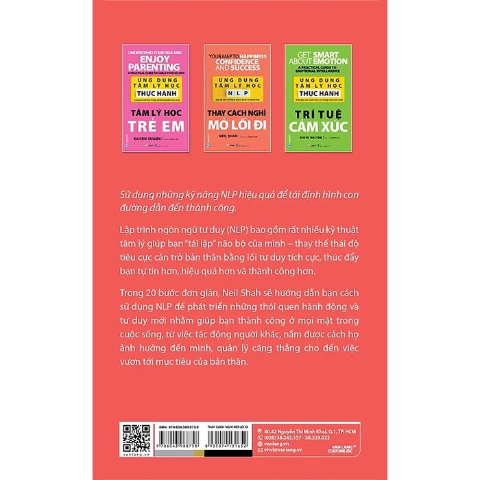 Ứng Dụng Tâm Lý Học NLP - Thay Cách Nghĩ Mở Lối Đi Ứng Dụng Tâm Lý Học NLP - Thay Cách Nghĩ Mở Lối Đi sử dụng những kỹ năng NLP hiệu quả để tái định hình con đường dẫn đến thành công. Lập trình ngôn ngữ tư duy (NLP) bao gồm rất nhiều kỹ thuật tâm lý giúp bạn “tái lập” não bộ của mình – thay thế thái độ tiêu cực cản trở bản thân bằng lối tư duy tích cực, thúc đẩy bạn tự tin hơn, hiệu quả hơn và thành công hơn. Trong 20 bước đơn giản, Neil Shah sẽ hướng dẫn bạn cách sử dụng NLP để phát triển những thói quen hành động và tư duy mới nhằm giúp bạn thành công ở mọi mặt trong cuộc sống, từ việc tác động người khác, nắm được cách họ ảnh hưởng đến mình, quản lý căng thẳng cho đến việc vươn tới mục tiêu của bản thân.