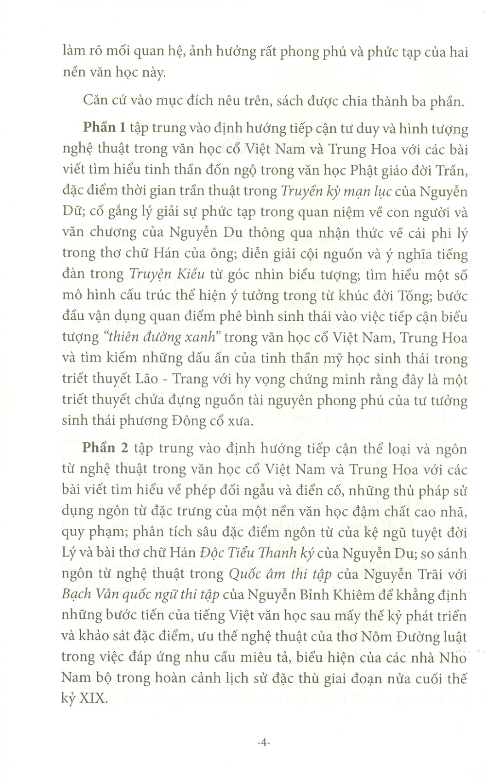 Những con đường, cách thức, phương tiện hay những góc độ tiếp cận khác nhau chẳng qua cũng chỉ nhằm phục vụ cho mục đích hướng tâm, đó là tiếp tục khám phá, khẳng định giá trị của tinh hoa văn học dân tộc trong bối cảnh giao lưu, tiếp biến giữa văn học Việt Nam với các nền văn học trong khu vực và trến thế giới. Hành trình khám phá, khẳng định những giá trị đó không bao giờ kết thúc và mỗi một nỗ lực tham gia, đóng góp đều xuất phát từ mong muốn được ghi nhận như là một dấu chân trong nhiều dấu chân tiếp nối. (Trích Lời Nói Đầu)