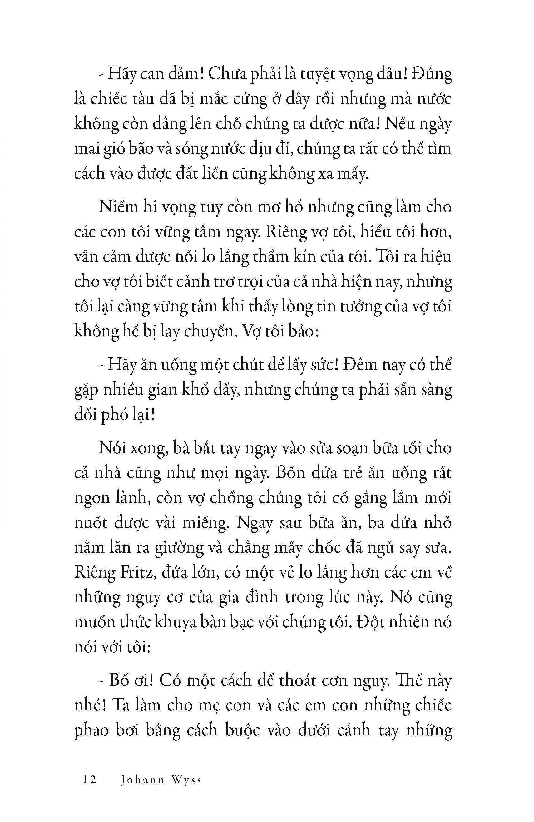 “Robinson Crusoe luôn luôn là một cuốn sách hay và tốt, nhưng Robinson Thụy Sĩ có lẽ xứng đáng vị trí đứng đầu tất cả những tác phẩm tưởng tượng thích ứng vào việc dạy dỗ cho trẻ con và việc dạy bảo cho người lớn... Nếu tôi có được vinh dự tạo được đôi phần ảnh hưởng tới những cuộc bàn luận của Viện Hàn lâm nước Pháp, tôi sẽ đề nghị tặng giải thưởng hàng năm cho Robinson Thụy Sĩ và tìm cách phân phát không tác phẩm ấy về tất cả các trường học...”