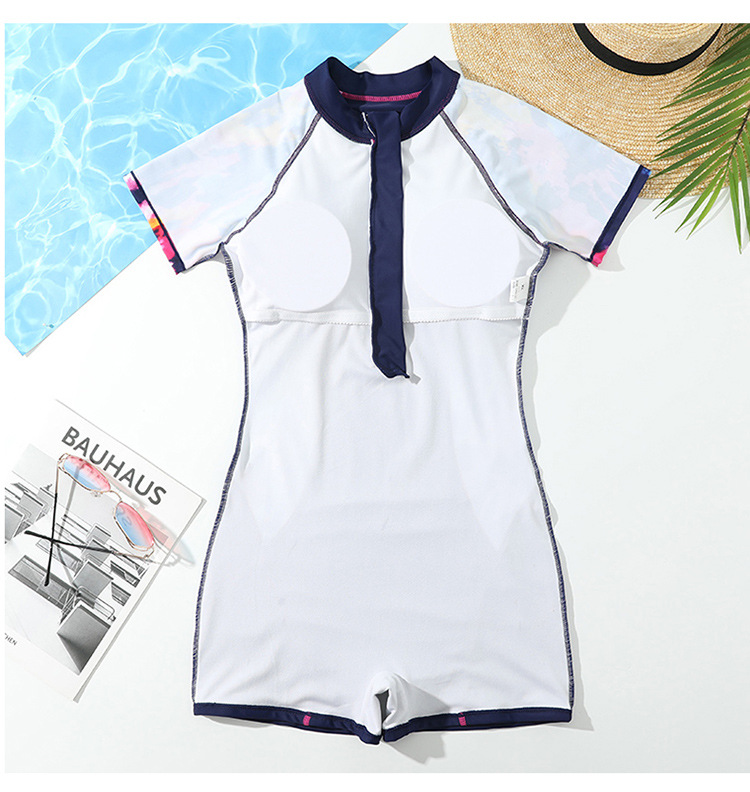 - Mẫu đồ bơi liền thân phong cách năng động tươi mới cho các cô gái trẻ trung. - Dáng cộc tay quần sooc đùi ôm gọn gàng cơ thể, khóa kéo trước tiện dụng