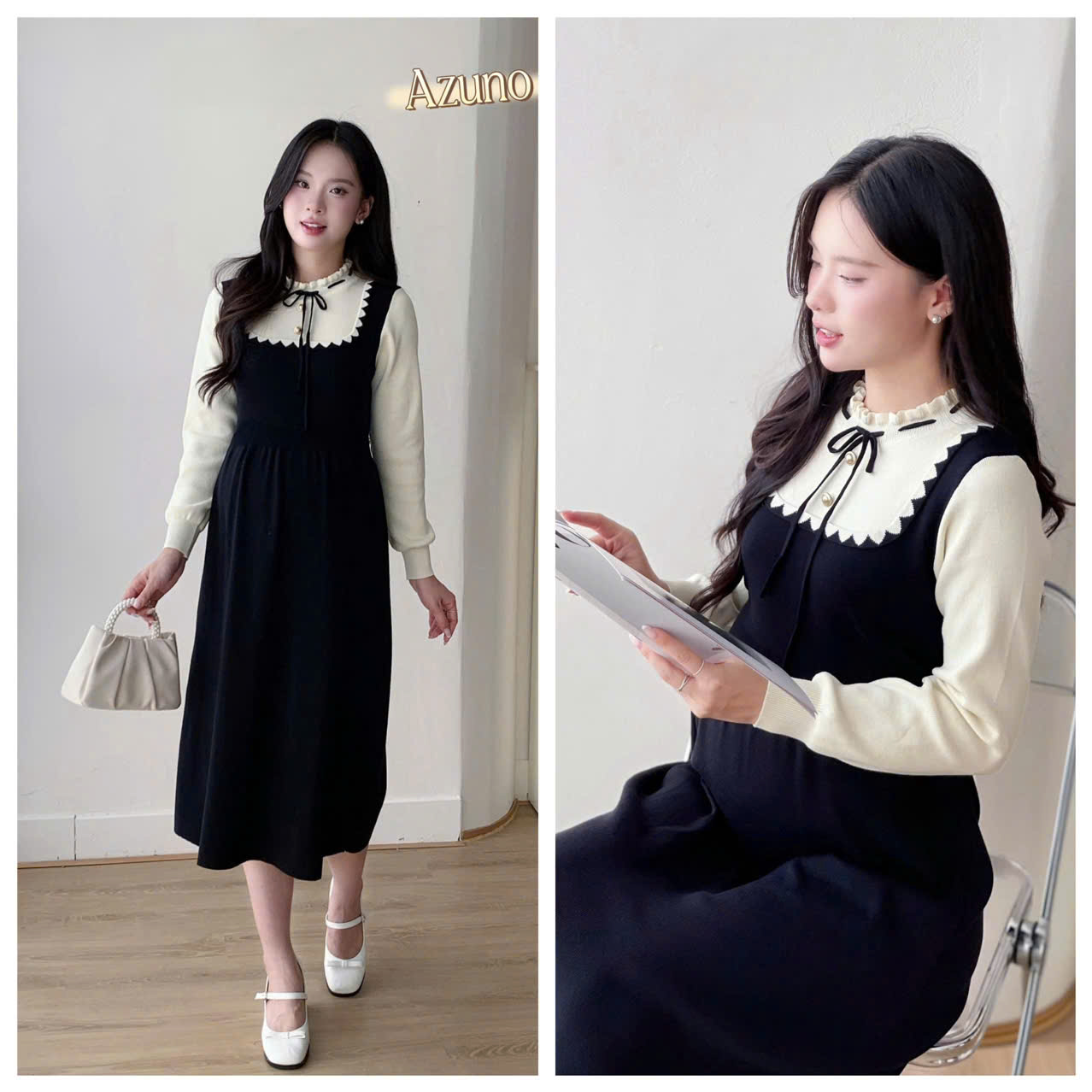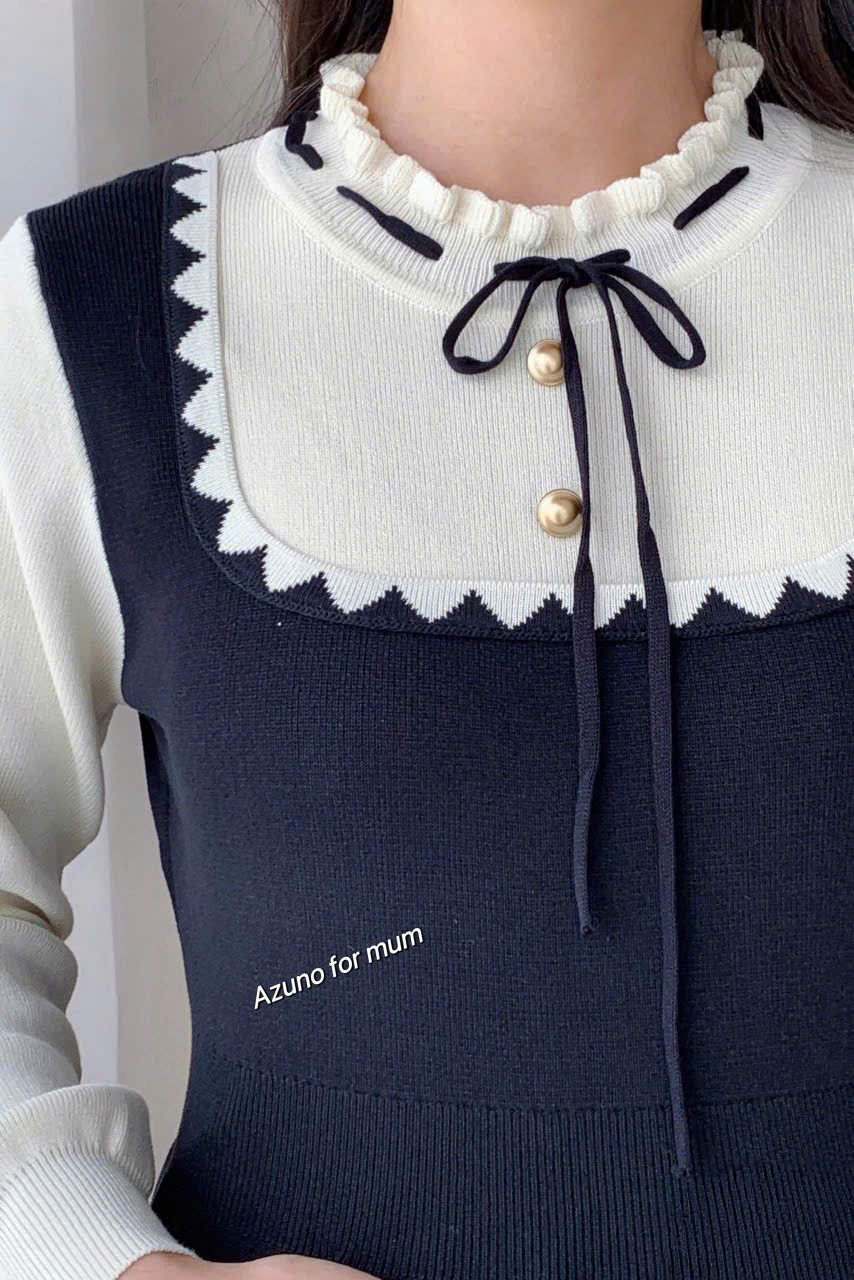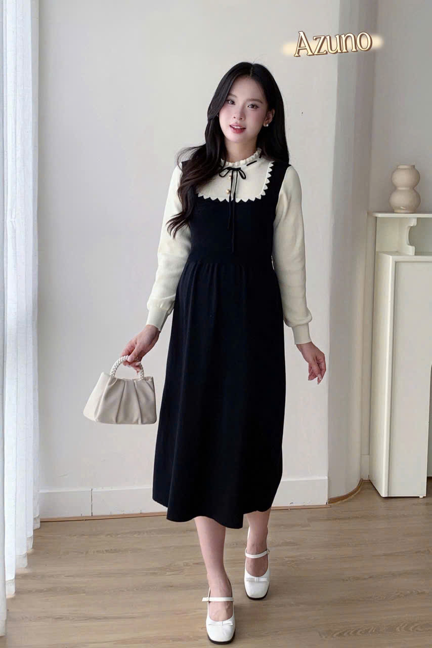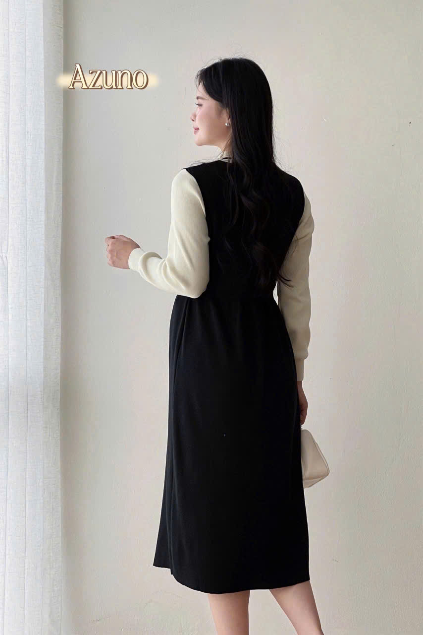 1. Thông tin chi tiết sản phẩm Váy bầu phối cổ tròn, đầm bầu đi làm, đi chơi, thiết kế sang trọng by Azuno Chất liệu chéo nhật phối trượt tằm xờ siêu mát tay