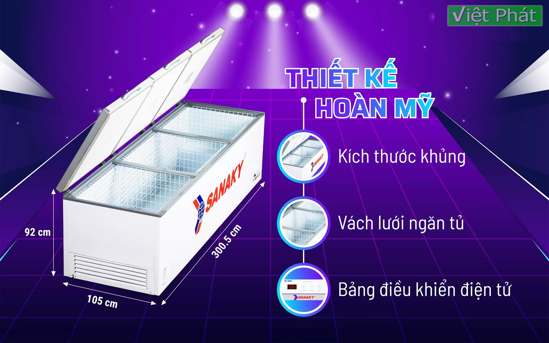 THÔNG SỐ KỸ THUẬT - Model: VH-1799HY3 - Dung tích thực: 1500 lít - Kích thước: 300.5 x 105 x 92 (cm) - Số ngăn: 1 ngăn đông - Số cánh: 3 cánh - Chất liệu dàn lạnh: Đồng - Công nghệ tiết kiệm điện: Inverter - Điều khiển điện tử màn hình LED - Nhiệt độ ngăn đông: ≤-18°C - Nguồn điện: 220V/50Hz - Công suất: 750 (W) - Trọng lượng: 145 (kg) - Môi chất lạnh: R290a - Bánh xe: 8 bánh xe chịu lực - Bảo hành: 24 tháng Tủ đông Sanaky VH-1799HY3 3 cánh với dung tích cực lớn 1500 Lít mang nhiều tính năng ưu việt được Sanaky cho ra mắt vào cuối năm 2022. Tủ đông Sanaky VH-1799HY3 được ví như một “KHO LẠNH DI ĐỘNG” vô cùng tiện lợi và hữu ích dành cho các nhà hàng, quán ăn lớn, chuỗi siêu thị,…có nhu cầu trữ đông lượng thực phẩm lớn Dung tích tủ đông Sanaky 3 cánh 1500 Lít