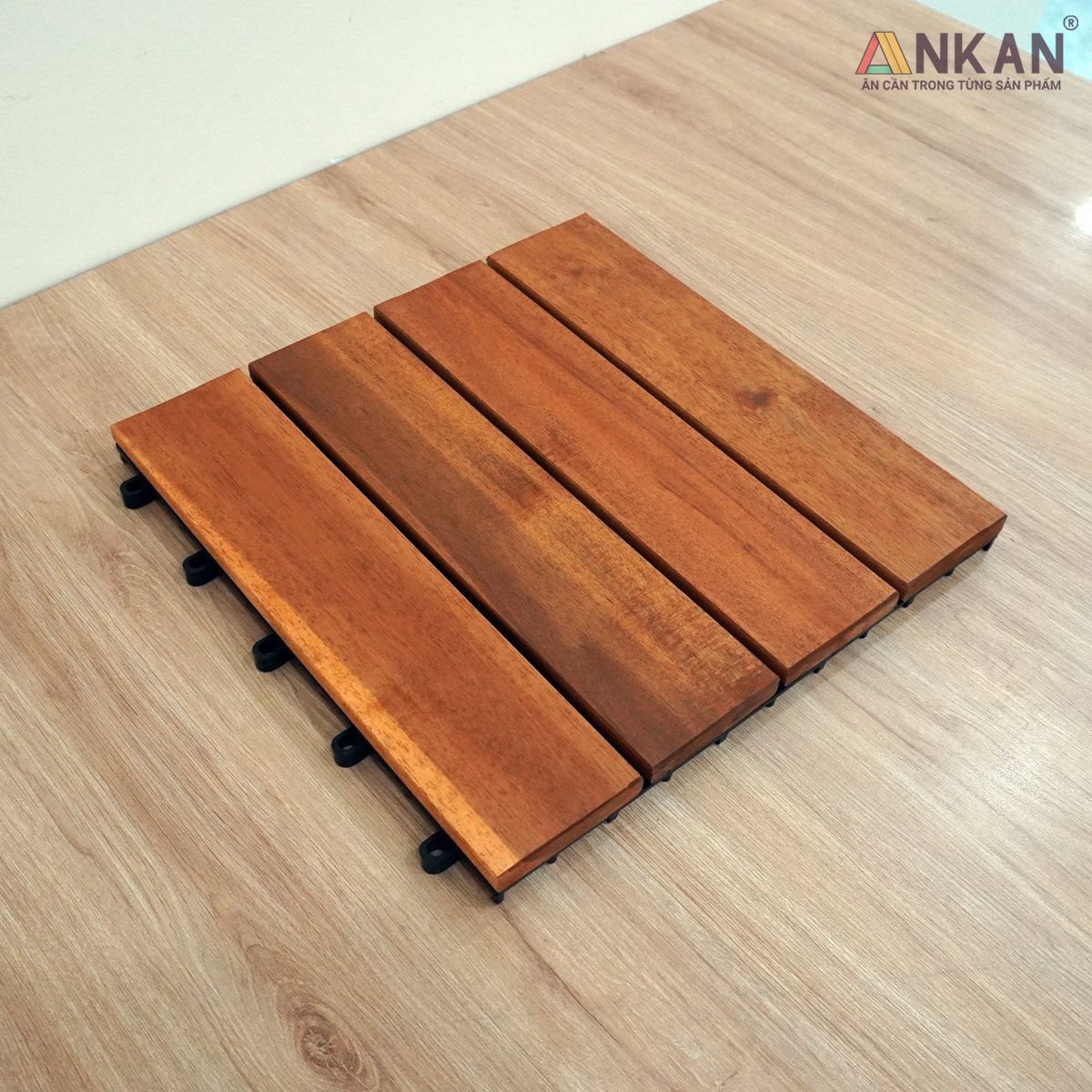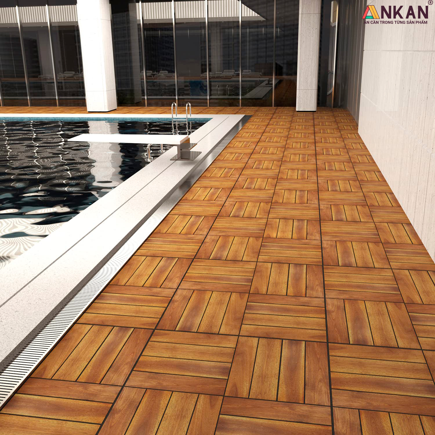 Mua tại Tiktok-- Vỉ gỗ lót sàn 4 nan là vỉ gỗ cao cấp nhất trong dòng vỉ gỗ lót sàn. Hiện tại, vỉ gỗ lót sàn chủ yếu xuất sang thị trường Mỹ với yêu cầu khắc khe từ đối tác. -- Do sản phẩm đẹp và độc đáo, ANKAN rất vui vì có thể cung cấp cho các bạn sản phẩm này với giá phải chăng và nhiều ưu đãi. ĐẶC ĐIỂM NỔI BẬT CỦA VỈ GỖ LÓT SÀN 4 NAN - Ván sàn gỗ 4 nan được chế tác từ thân gỗ tràm bông vàng loại cây to, ít nhất 10 năm tuổi. - Đế được làm từ nguyên liệu nhựa PP tốt, có khả năng chịu trọng lượng tương đương 1 chiếc xe bán tải. - Được giảm bén ở các cạnh kĩ càng, an toàn cho trẻ nhỏ. - Màu sắc đẹp tự nhiên, lâu phai màu, chịu được thời tiết nóng ẩm mưa nhiều ở Việt Nam. MÔ TẢ CHI TIẾT VỈ GỖ LÓT SÀN 4 NAN Tên sản phẩm: Vỉ gỗ lót sàn, ván sàn gỗ vỉ nhựa, sàn gỗ vỉ nhựa, sàn gỗ lót ban công, tấm ván sàn gỗ. Thương hiệu ANKAN Kích thước 30cm x 30cm x 2.4cm Độ dày phần gỗ 1.3cm Loại gỗ Gỗ tràm bông vàng đạt chuấn xuất khẩu Châu Âu, Bắc Mỹ. Loại đế nhựa: Nhựa PP loại tốt, chịu được sức nặng của xe bán tải. Màu sắc Màu vàng nắng Kỹ thuật màu Dầu gốc nước, an toàn cho người sử dụng, đạt tiêu chuẩn của TUV ƯU ĐIỂM VỈ GỖ LÓT SÀN 4 NAN ANKAN Gỗ tràm bông vàng có những đặc tính tương đồng với gỗ Teak ở Châu Âu nên có chất lượng vô cùng tốt và được lựa chọn làm ván sàn gỗ 4 nan. - Khả năng chống thấm nước tốt. - Chống mối mọt, côn trùng phá hoại. - Chống cong vênh, co ngót. - Lắp đặt dễ dàng. - Công thức pha màu độc quyền, cho màu sắc tự nhiên và bền màu. ỨNG DỤNG - Sử dụng làm sàn cho sân vườn, hành lang, lối đi ngoài trời. - Sử dụng cho nhà tắm, phòng sauna tắm hơi - Sử dụng cho bể bơi, bãi biển, công viên. - Đệm lưng khi ngủ dưới nền nhà. XEM THÊM ẢNH VỈ GỖ LÓT SÀN 4 NAN Vỉ gỗ lót sàn 4 nan là loại vỉ mà chúng tôi thích nhất, giá thành có cao hơn vỉ thông thường một chút nhưng sự khác biệt ra to lớn. Chúng ta cùng nhau xem qua những ảnh bên dưới bạn nhé. TẠI SAO NÊN CHỌN ANKAN OFFICIAL