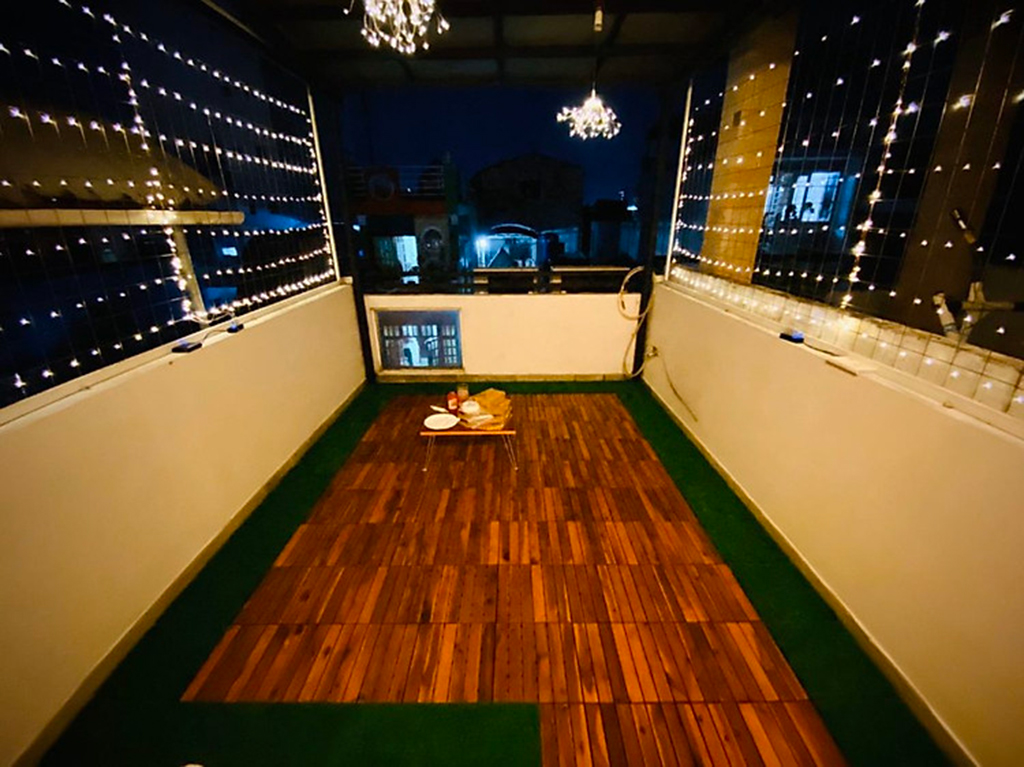 - Việc sử dụng chất liệu gỗ để lót sàn giúp đồng điệu với cây xanh, tranh trí tiểu cảnh ở ban công.