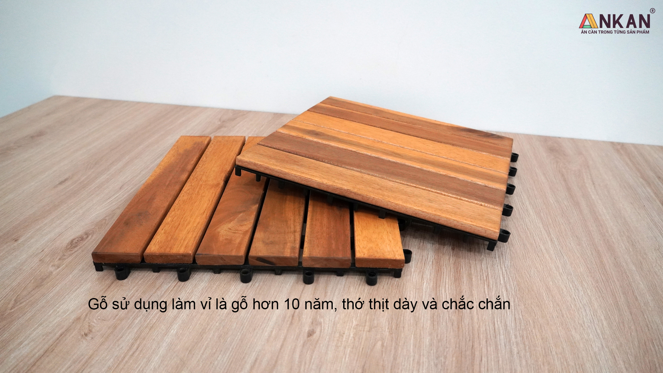 Ván gỗ lót sàn ban công 6 nan là vỉ gỗ đẹp và dễ lắp đặt nhất và bán chạy nhất trong tất cả các loại vỉ hiện này. Sản phẩm này còn được xuất khẩu sang nhiều quốc gia như Nhật Bản, Đức và Mỹ. Chúng ta hãy cùng nhau xem qua sản phẩm này nhé. CHI TIẾT VÁN GỖ LÓT BAN CÔNG 6 NAN Tên sản phẩm: Vỉ gỗ lót sàn, ván sàn gỗ vỉ nhựa, sàn gỗ vỉ nhựa, sàn gỗ lót ban công, tấm ván sàn gỗ. Thương hiệu ANKAN Kích thước 30cm x 30cm x 2.4cm Độ dày phần gỗ 1.2cm Loại gỗ Gỗ tràm bông vàng đạt chuấn xuất khẩu Châu Âu. Loại đế nhựa: Nhựa PP loại tốt, chịu được sức nặng của xe bán tải. Màu sắc Màu vàng nắng Kỹ thuật màu Dầu gốc nước, an toàn cho người sử dụng, đạt tiêu chuẩn của TUV ƯU ĐIỂM CỦA VÁN GỖ LÓT BAN CÔNG 6 NAN