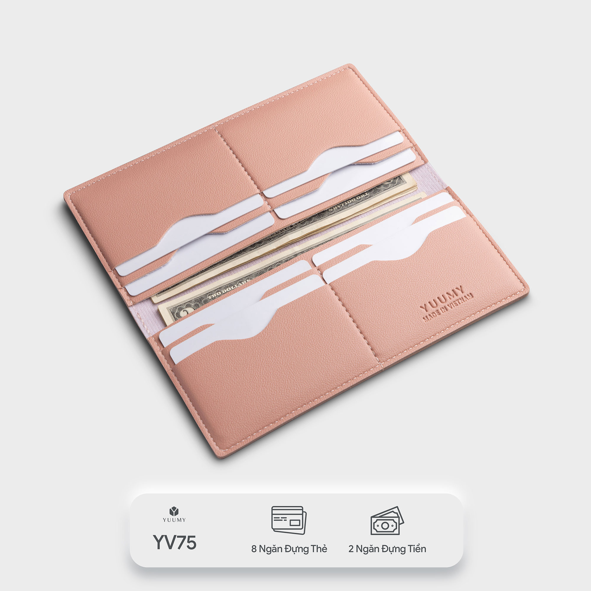 Ví da nữ cầm tay YUUMY YV75 được thiết kế dáng đứng phổ thông, gập đôi tiện dụng, kích thước vừa tay và siêu mỏng. Ví gồm 2 ngăn lớn đựng tiền mặt và nhiều