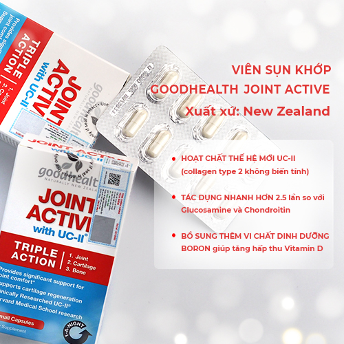 GIỚI THIỆU SẢN PHẨM GOODHEALTH JOINT ACTIVE  Viên sụn khớp Goodhealth Joint Active: Hộp 30 viên nang Sản phẩm Joint Active được nhập khẩu chính hãng từ Good Health New Zealand - thương hiệu nổi tiếng về các sản phẩm bảo vệ sức khỏe có nguồn gốc từ tự nhiên. UC-II được chiết xuất hoàn toàn từ sụn ức gà nên đảm bảo lành tính, an toàn cho người sử dụng. Dựa theo các nghiên cứu lâm sàng cho đến nay chưa ghi nhận tác dụng phụ nào từ UC-II cho những người gặp vấn đề về xương sụn khớp.    ƯU ĐIỂM NỔI BẬT  Bổ sung hoạt chất thế hệ mới UC-II (Collagen type 2 không biến tính)  UC-II (collagen type 2 không biến tính) trong thành phần của Viên sụn khớp Joint Active là hoạt chất thế hệ mới đã được nghiên cứu và kiểm định lâm sàng bởi Đại học Y khoa Harvard mang lại hiệu quả rõ rệt trong việc nuôi dưỡng và phục hồi sụn khớp bị tổn thương, tăng tiết dịch khớp trong trường hợp khô khớp, giúp giảm viêm, giảm đau và ngăn ngừa thoái hóa khớp.  Viên sụn khớp Joint Active hiện đang nhận được nhiều phản hồi tích cực từ những người gặp vấn đề về sụn khớp như dân văn phòng, người chơi thể thao và đặc biệt là người cao tuổi. Cơ chế 3 tác động  Thành phần trong viên sụn khớp Joint Active được kết hợp với mục đích các chất bổ trợ nhau, giúp tăng cường hiệu quả của các chất còn lại.  Thông qua đường uống, Collagen tuýp II không biến tính bổ sung Collagen tại các sụn khớp, giúp giảm đau, tái tạo và nuôi dưỡng sụn khớp. Một phần UC-II được hấp thu còn giúp điều chỉnh đáp ứng miễn dịch, bảo vệ sụn khớp, hỗ trợ làm chậm quá trình thoái hóa khớp.  Bên cạnh đó, Vitamin D trong Joint Active giúp hấp thụ canxi và phospho phòng tránh loãng xương, bảo vệ xương dưới sụn giúp ngăn ngừa thoái hóa sụn.  Đặc biệt, Joint Active còn được bổ sung thêm Boron – vi chất dinh dưỡng giúp hấp thụ vitamin D, làm tăng mật độ xương giúp xương chắc khỏe, chống viêm, giảm viêm khớp, ngăn ngừa loãng xương.  Tác dụng và hiệu quả nhanh hơn  Hợp chất UC-II được đã được nghiên cứu, kiểm định lâm sàng bởi Đại học Y khoa Harvard an toàn và hiệu quả gấp 2,3 lần so với Glucosamine và Chondroitin.  Trên Tạp chí International Journal of Medical Science, nghiên cứu được đăng tải của tác giả David C. Crowley cũng cho thấy Collagen tuýp II không biến tính giúp hỗ trợ giảm tình trạng cứng khớp và khó vận động là 33%, hỗ trợ giảm tình trạng đau nói chung đến 44%, chỉ trong 90 ngày. Không tác dụng phụ Các hoạt chất đều nghiên cứu ở hàm lượng an toàn, không gây ảnh hưởng tới tiêu hóa hay bất kì tác dụng phụ nào, hoàn toàn có thể sử dụng lâu dài.  THÀNH PHẦN CỦA VIÊN SỤN KHỚP JOINT ACTIVE  Trong mỗi viên Goodhealth Joint Active có chứa: Thành phần (cho 1 viên)